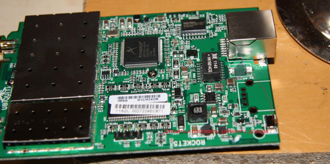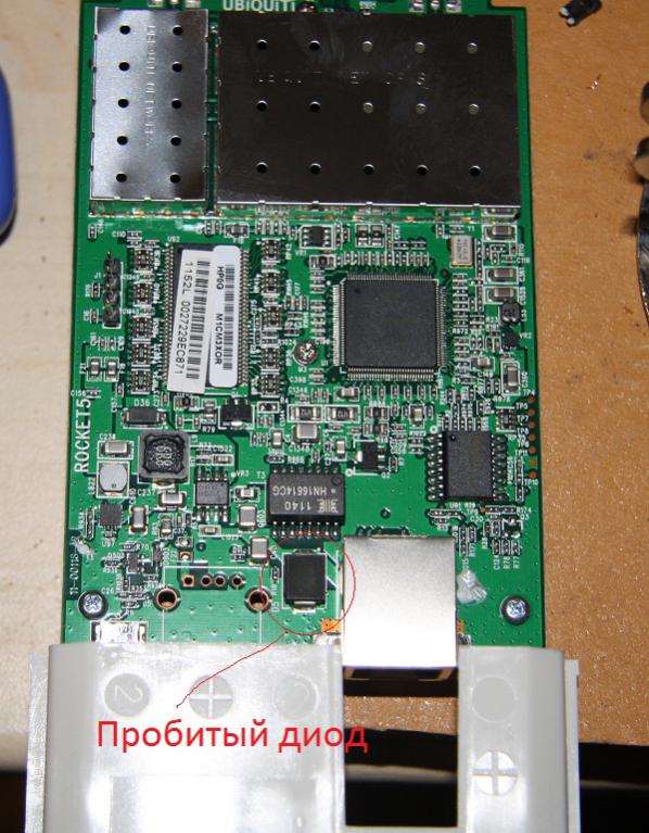 При диагностике было выявлено, что диод пробит высоким напряжением. Он сильно грелся. Отпаяв его, берем точно такой же с донора. У меня был дохлый ROCKET M2. Возможно, можно использовать диод подобного размера с любого другого оборудования. Была мысль попробовать вставить туда советский д220. Но в моем случае под рукой оказался донор.
