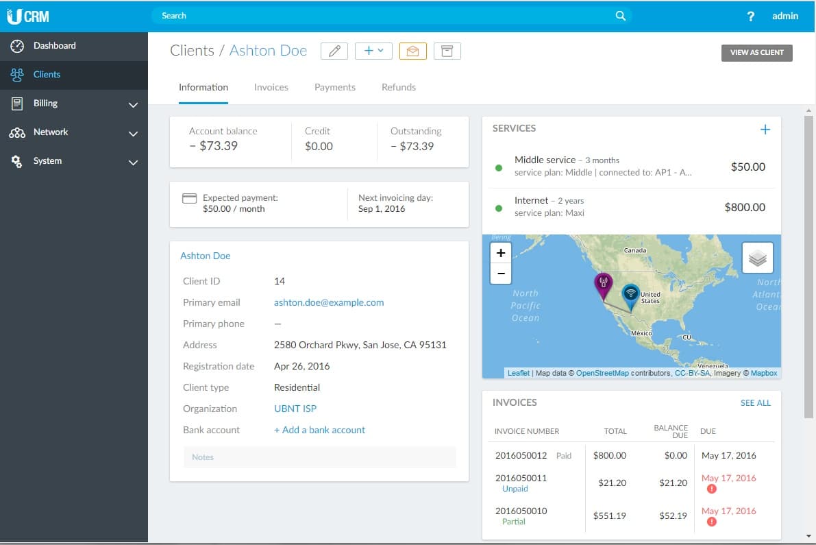 Именно поэтому разработчики Ubiquiti Networks создали собственную биллинговую систему для провайдеров UCRM, которая наилучшим образом оптимизирована для использования на оборудовании компании. Система может очень многое - обрабатывать платежи с кредитных карт, позволяет формировать счета и управлять трафиком подключенных абонентов