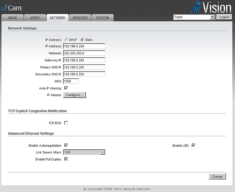 После того, как мы узнали IP-адрес камеры, набираем его в адресной строке браузера. В появившемся окне авторизации вводим логин и пароль по умолчанию: ubnt (логин), ubnt (пароль). После успешного ввода, мы попадаем на первую вкладку Main, где узнаем общую информацию о AirCam (MAC-адрес, имя устройства, время подключения), внизу есть несколько подразделов дополнительной информации. Здесь мы также можем просмотреть изображение с камеры.