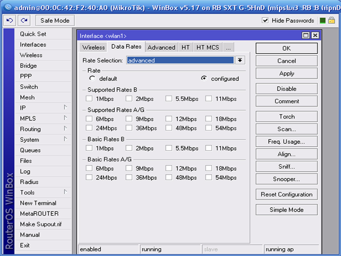 | Привычный веб-интерфейс AirOS v5 позволяет задавать параметры сети, шифрования данных, мощность и другие настройки, типичные для точки доступа. | Маршрутизатор работает под управлением RouterOS с лицензией Level 4. Интерфейс RouterOS позволяет производить детальную настройку устройства и задавать параметры мощности сигнала, шифрования, сети и т.п. |