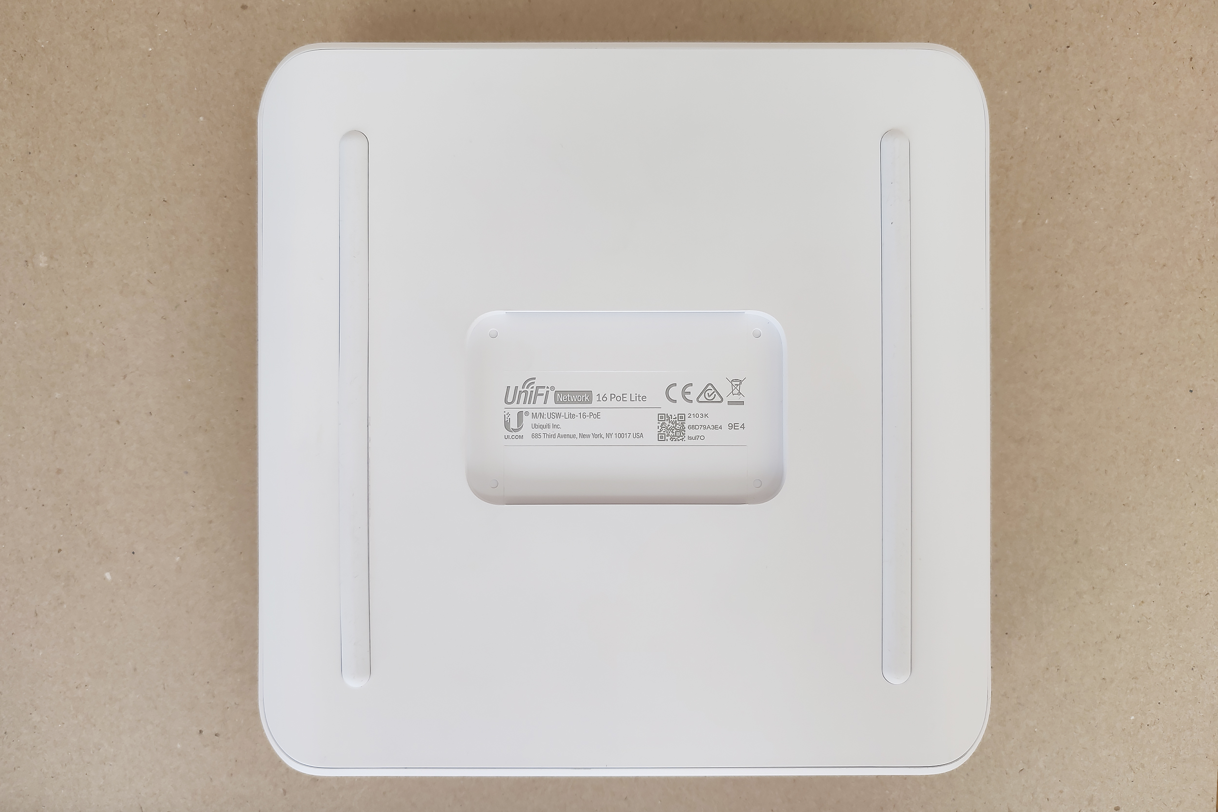 Внешний вид USW Lite 16 PoE свитча довольно сильно отличается от другого оборудования серии. Модель адаптирована для применения вне стойки, и имеет специальное крепление для настенной установки. Специальная пластина-основание крепится к стене позволяя осуществлять быстрый демонтаж свитча, при возникновении такой необходимости.