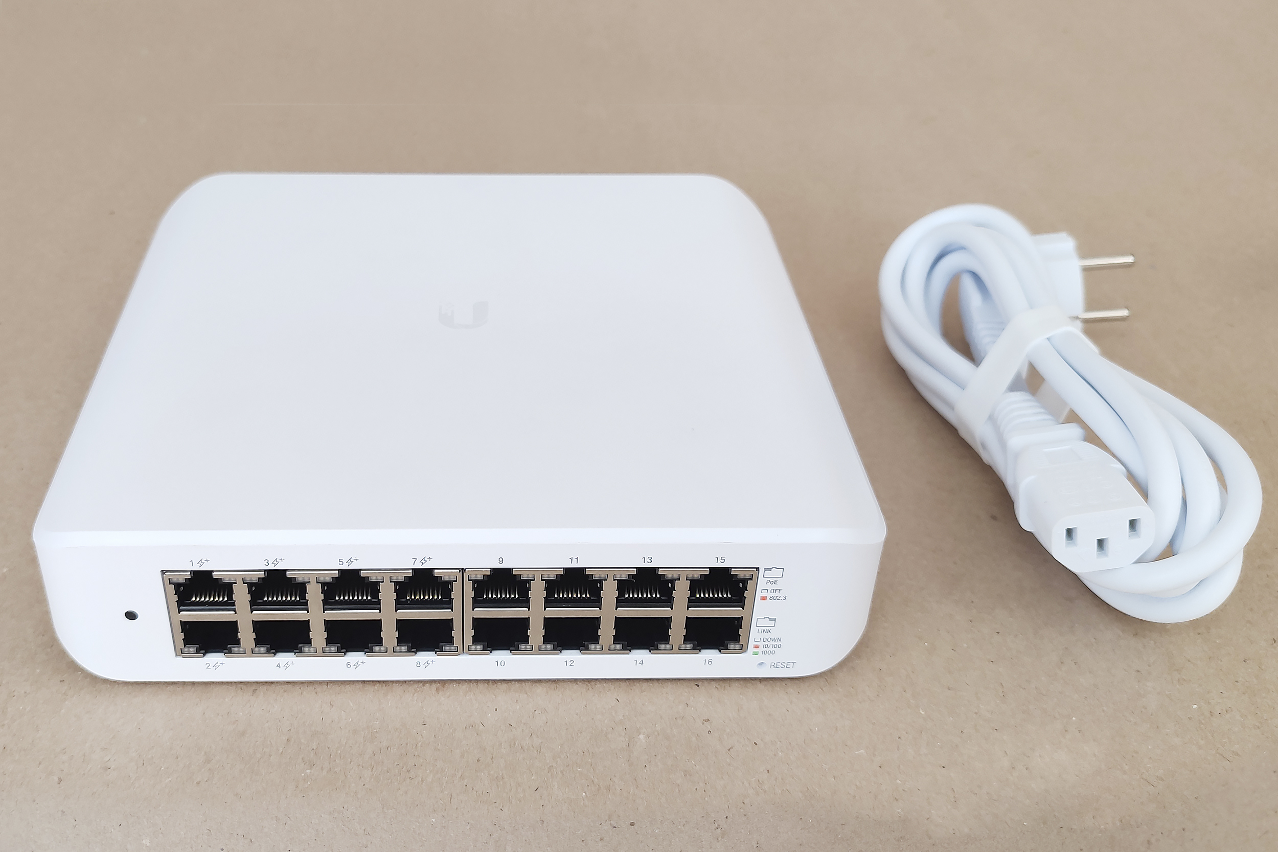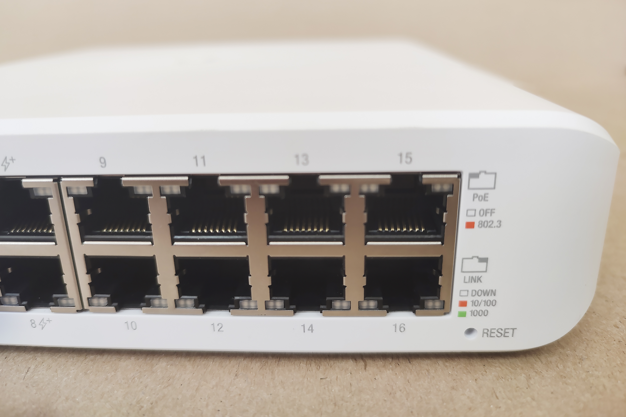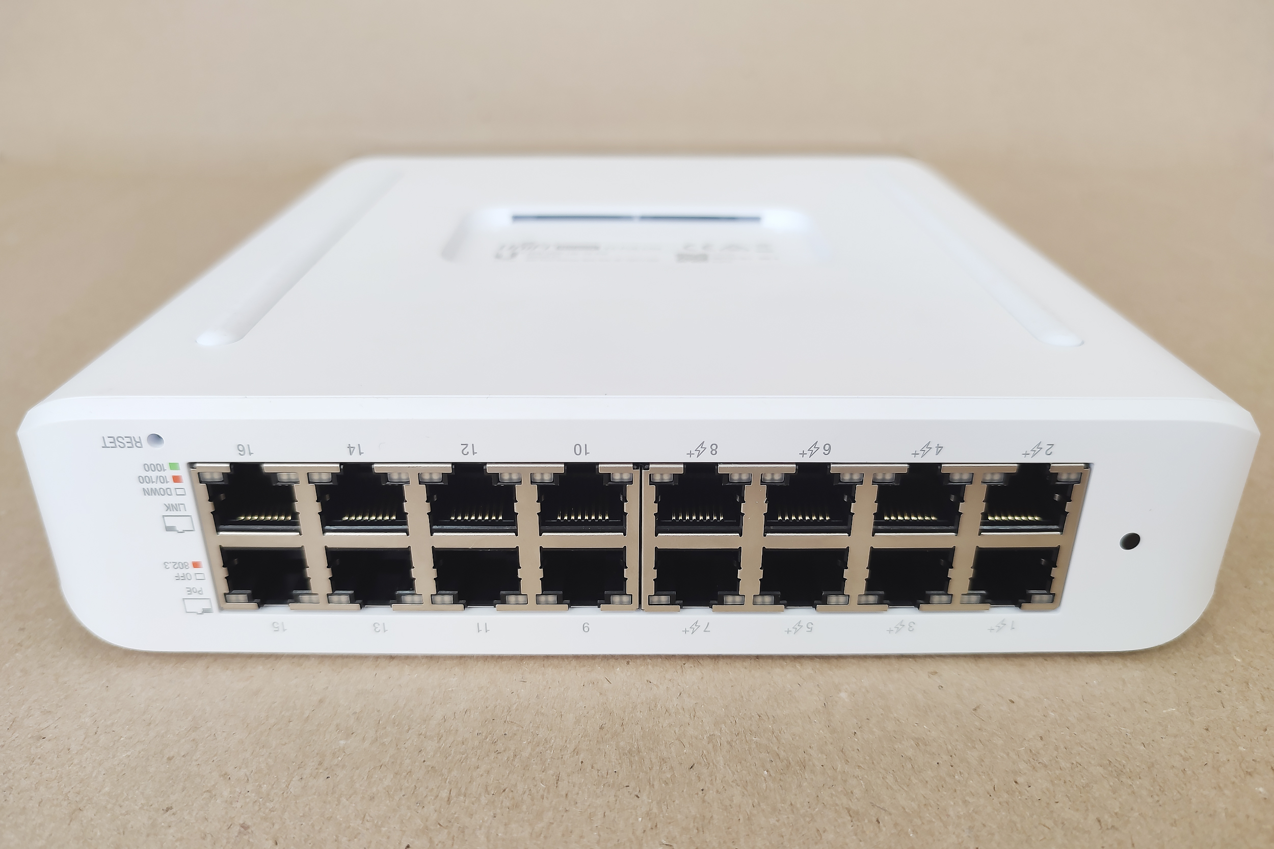 UniFi Switch Lite 16 PoE получил 16 гигабитных портов Ethernet. Порты с первого по восьмой при этом способны раздавать PoE, что позволяет организовать питание клиентского оборудования. Большим плюсом модели является автоопределение стандарта, используемого PoE потребителем, в том числе с возможностью работы в рамках 802.3at PoE+.