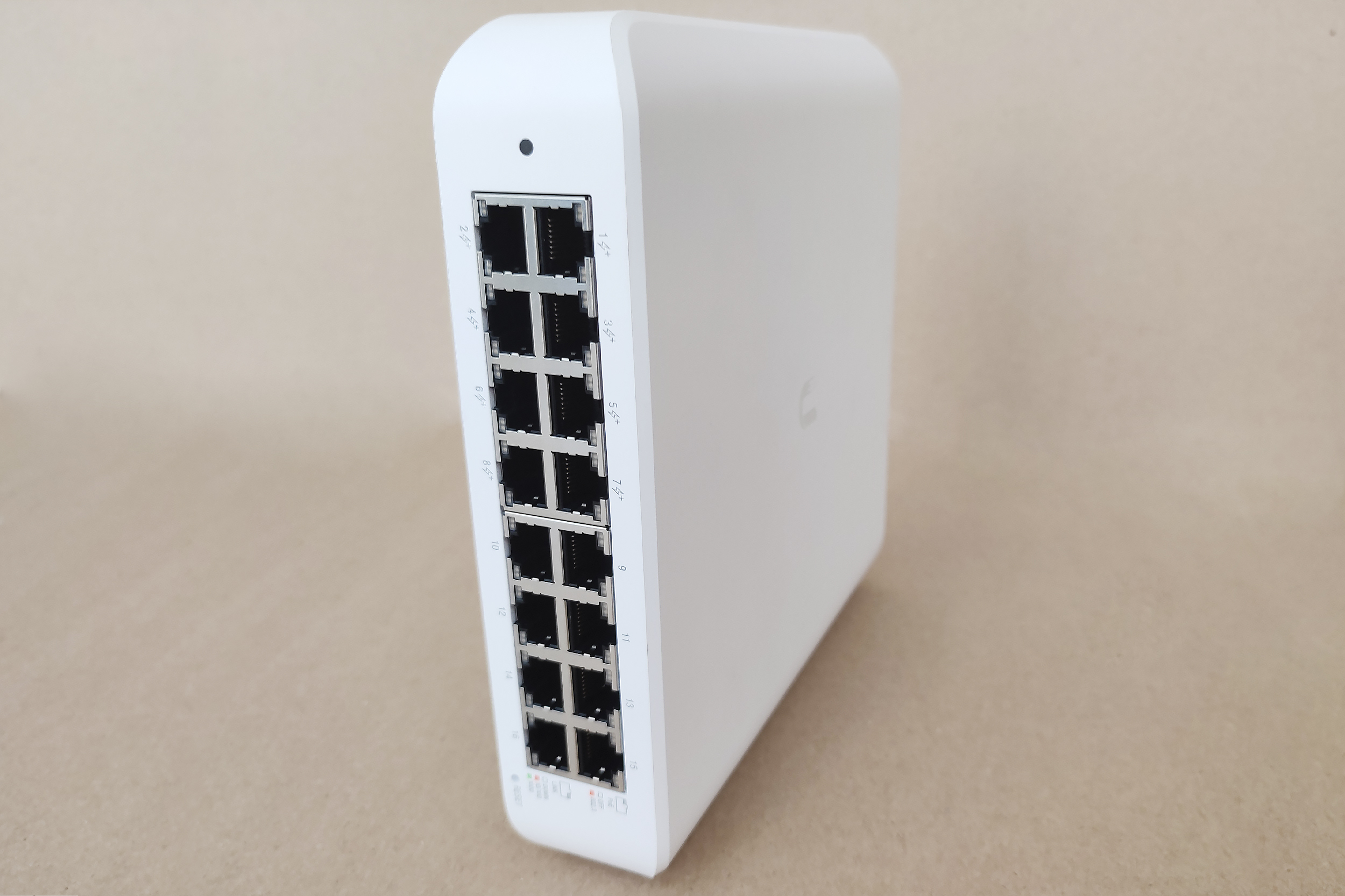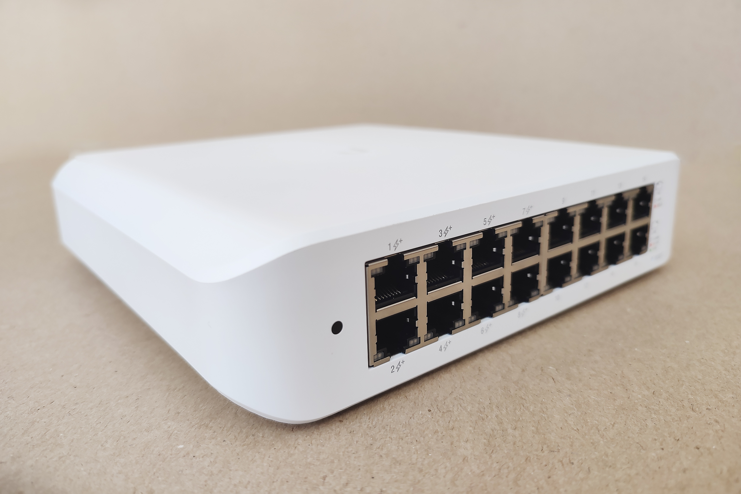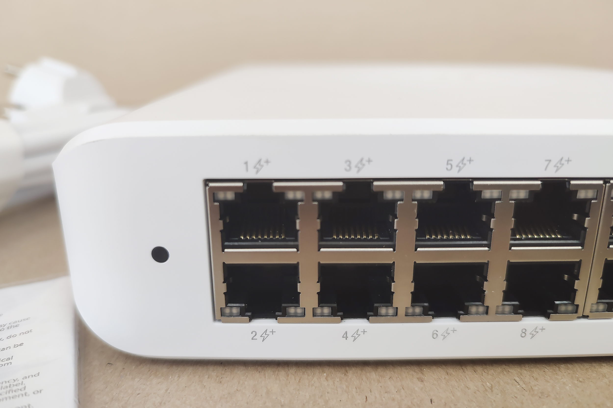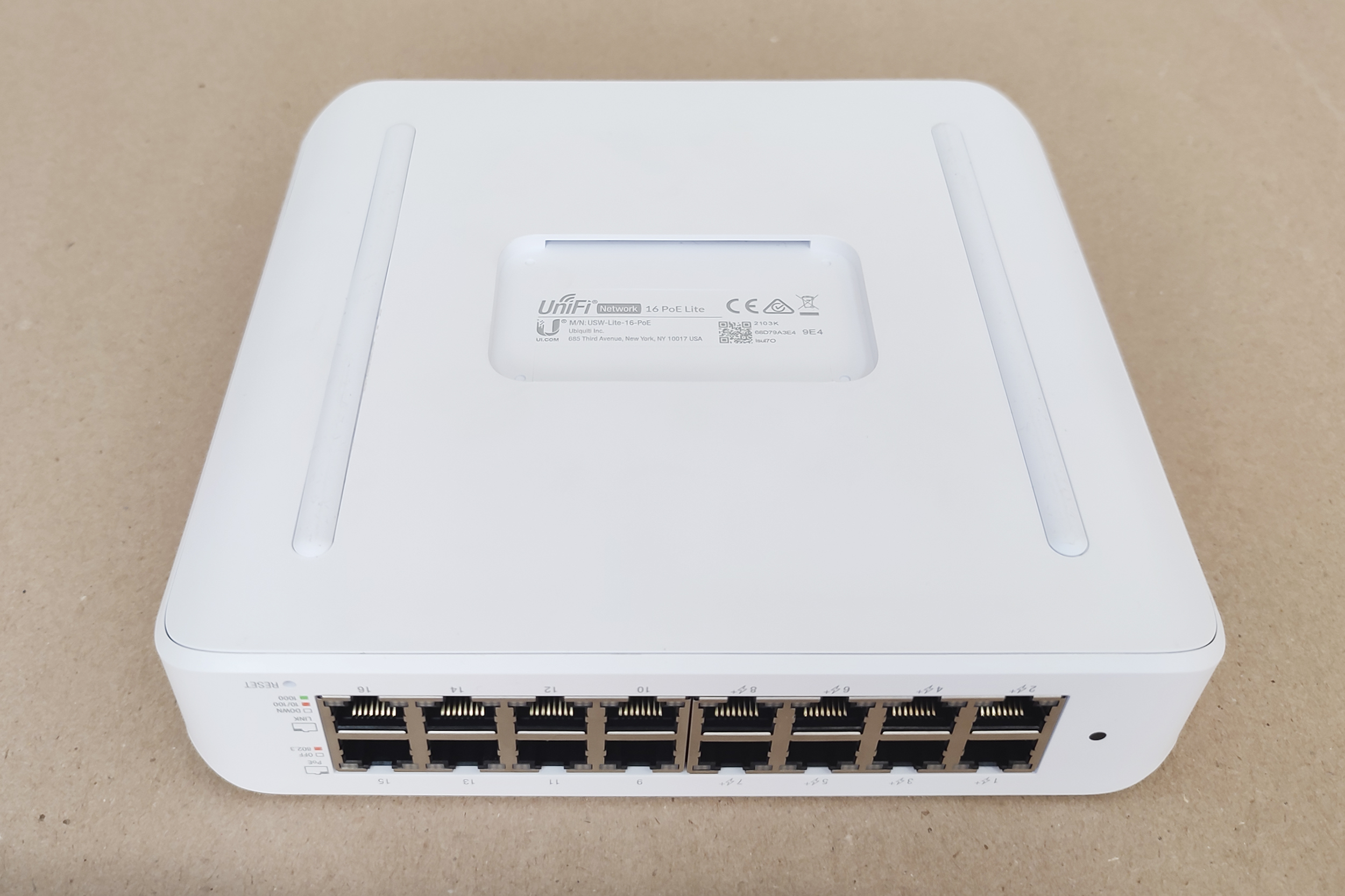 UniFi Switch Lite 16 PoE получил 16 гигабитных портов Ethernet. Порты с первого по восьмой при этом способны раздавать PoE, что позволяет организовать питание клиентского оборудования. Большим плюсом модели является автоопределение стандарта, используемого PoE потребителем, в том числе с возможностью работы в рамках 802.3at PoE+.