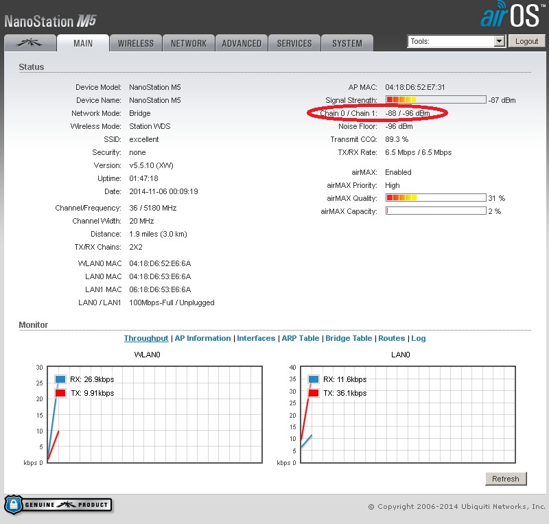 Приветствую всех. Недавно настроил WiFi мост на двух точках доступа nanostation m5. Перед установкой запустил конфигурацию дома в комнате, на расстоянии 5 метров. Все хорошо подхватилось и соединение прекрасно работало. Потом установил точки доступа на месте использования, расстояние по прямой 1800 метров. Высота 13 и 14 метров от земли. Прямая видимость есть, в основном все свободно, хотя, верхушки деревьев кое где есть.