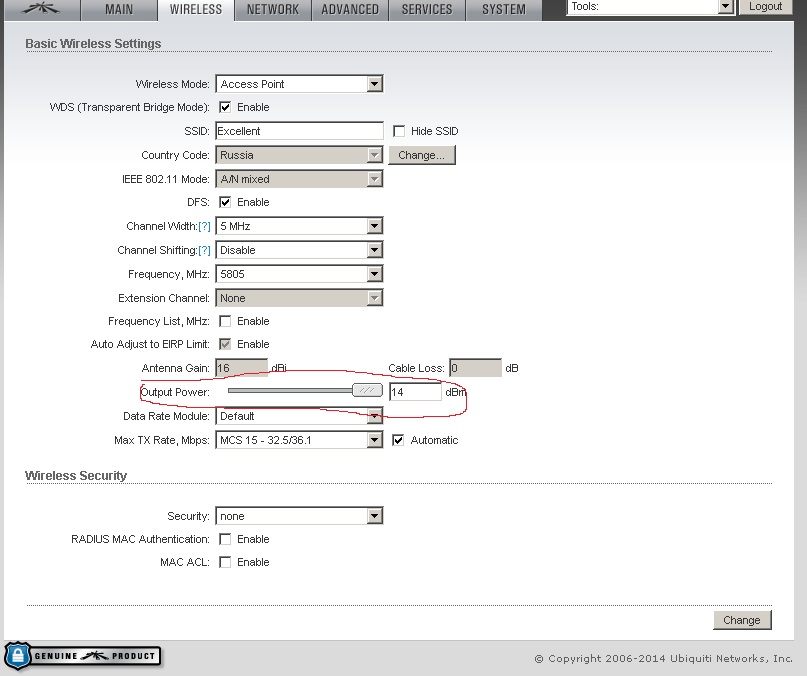 1. На вкладке «Wireless» видно, что Ваши точки доступа работают на уменьшенной мощности, всего лишь 14 dbm, притом что максимально возможная составляет 27 dbm. Следует сменить регион использования на USAи увеличить ползунком мощность.