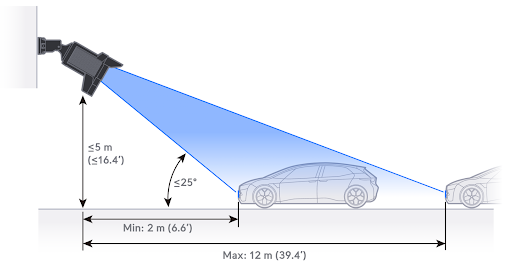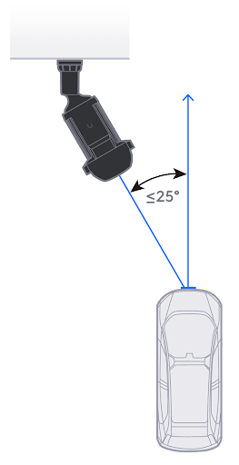 Камеру AI LPR следует устанавливать как можно ближе к номерным знакам, одновременно минимизируя угол съемки. Это особенно важно для надежного распознавания ночью. ИК-подсветка хуже отражается от номерных знаков, которые находятся далеко или под большим углом. По возможности выберите точку крепления как можно ближе к проезжей части или над ней, чтобы соответствовать требованиям:
