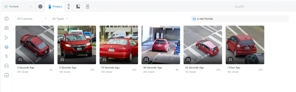 Каждое интеллектуальное обнаружение, обработанное AI Key, анализируется и классифицируется в фоновом режиме. Это позволяет использовать естественно-языковой поиск NeXT AI на вкладке "Найти всё". Введите запрос в строку поиска, чтобы быстро найти записи на основе общего описания. Лучшие результаты достигаются, когда поиск описывает людей или транспортные средства.