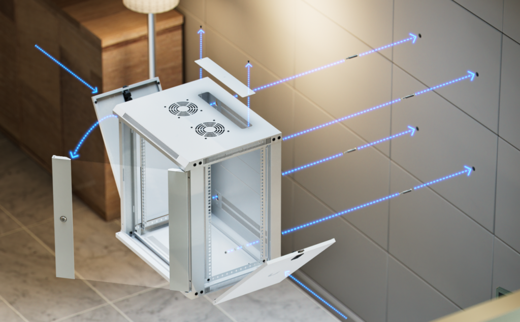 Ubiquiti 12U Rack Cabinet — настенный серверный шкаф высотой 12U с дверью из закалённого стекла. Поставляется полностью собранным, оснащён встроенным вентилятором, съёмными запираемыми боковыми панелями и удобными кабельными вводами. Подходит для размещения 19-дюймового сетевого и серверного оборудования в офисах и небольших серверных помещениях.