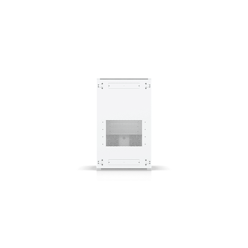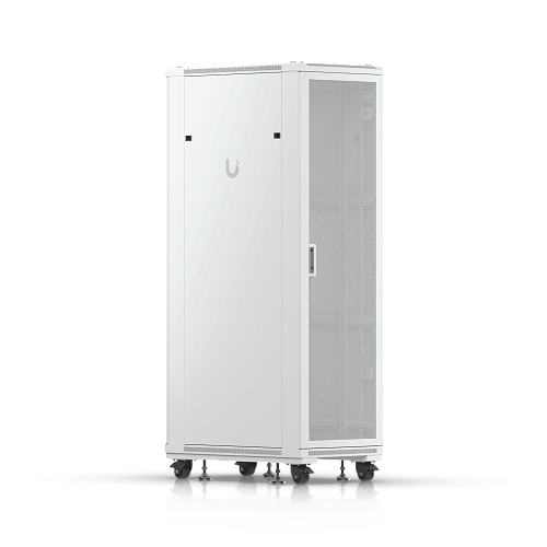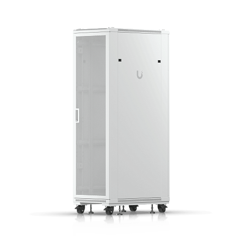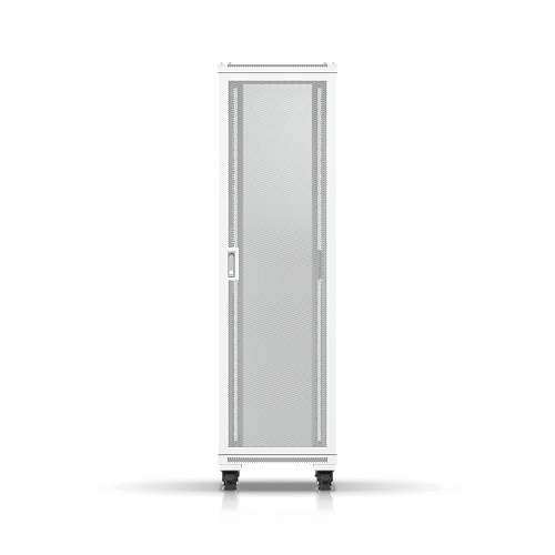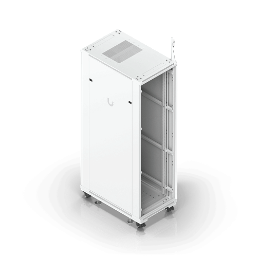 Полностью собранный напольный шкаф с стеклянной передней дверью, вентиляционной задней панелью, двумя вентиляторами и съемными боковыми панелями.