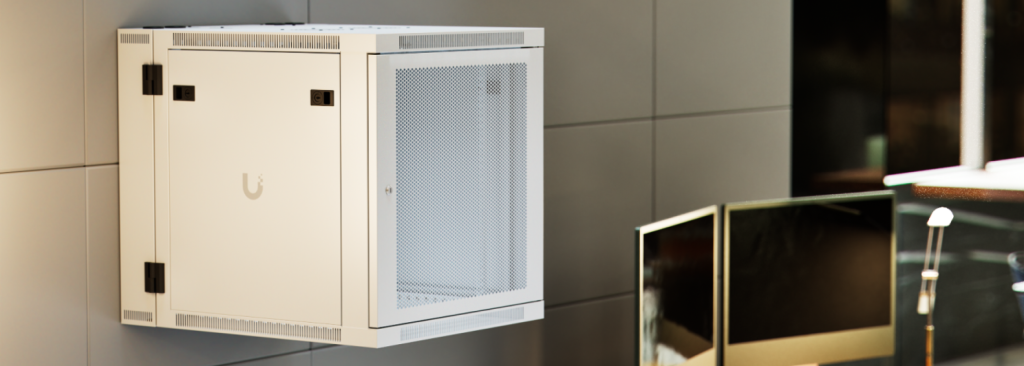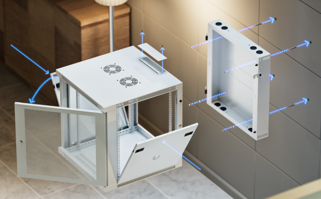 Ubiquiti UACC-Rack-12U-Wall-SW-P — настенный шкаф формата 12U, поставляемый полностью собранным. Оснащён передней дверью из закалённого стекла, задней распашной металлической дверью, встроенными вентиляторами, съёмными запираемыми боковыми панелями и удобными кабельными вводами. Подходит для размещения 19-дюймового сетевого и серверного оборудования в офисах, техпомещениях и небольших серверных.