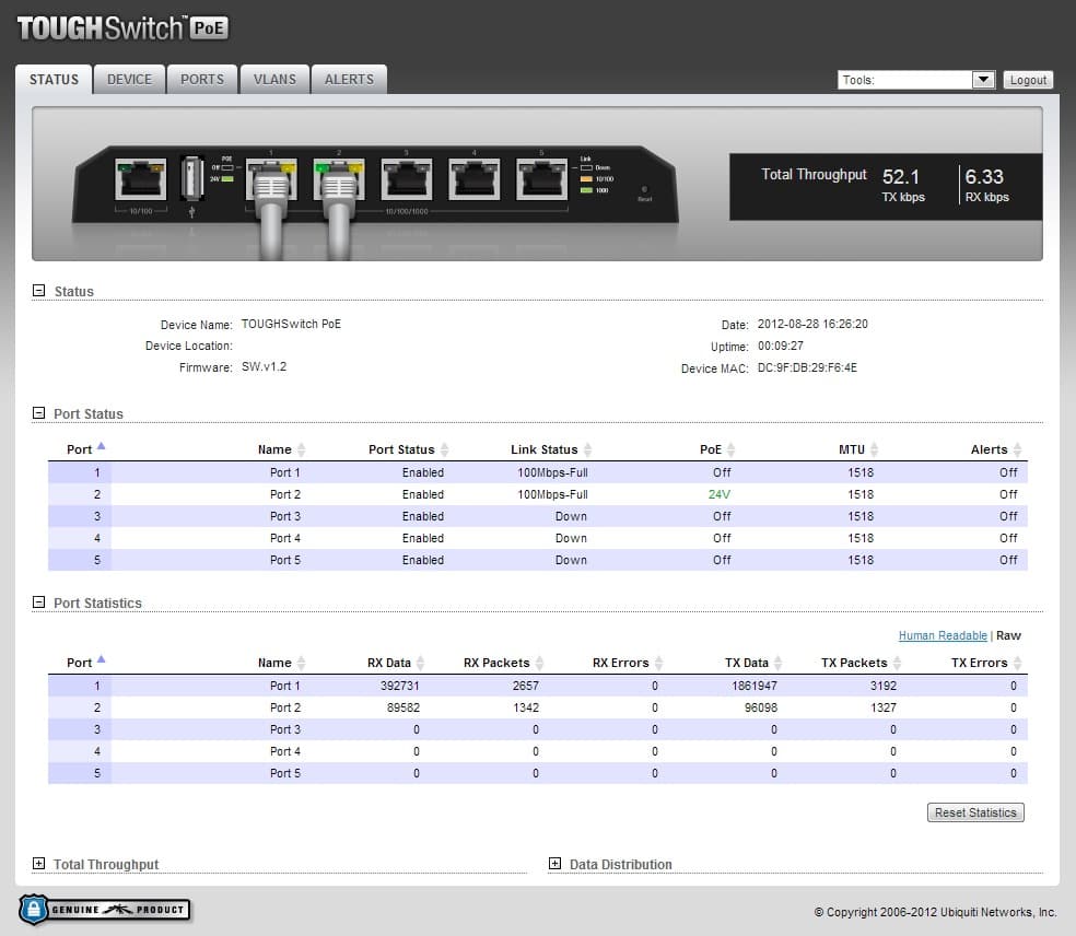 Все коммутаторы позволяют подавать питание на подключенные к портам устройства. Коммутаторы не поддерживают технологию 802.3af, требуется активация питания на выбранном порту в меню устройства. Старшие модели, благодаря поддержке, наряду с привычным для Ubiquiti напряжением питания 24 вольт, напряжения 48 вольт, способны обеспечивать питание устройств сторонних производителей, рассчитанных на питание по стандарту 802.3 af. Поскольку питание подается без опроса потребителя, готов ли он его принять, порты на панели устройства имеют дополнительный индикатор, святящийся, даже при не подключенном кабеле, зеленым, если порт настроен на 24 вольта и желтым в случае 48 вольт. Меню устройства выполнено в классическом для Ubiquiti интуитивно понятном стиле. На первой странице мы видим статистику устройства: