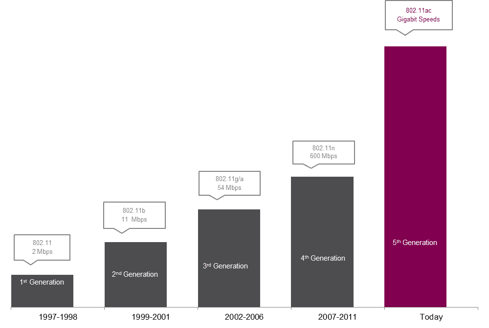 Технологии беспроводной передачи данных, которая стала известна под названием ieee 802.11 или, как это звучит намного привычнее, - WiFi, уже более 20 лет. Первые спецификации были выпущены в 1998-99x годах, получив обозначение 802.11\b и обеспечивали скорость передачи данных до 11 мбит\Сек, при этом использовался радиодиапазон 2.4 Ггц. В том же 1999 году скорость была значительно увеличена благодаря параллельной разработке стандарта 802.11\а с использованием частот 5 Ггц достигнув 54 мбит\Сек.