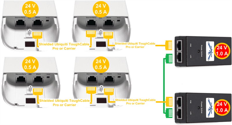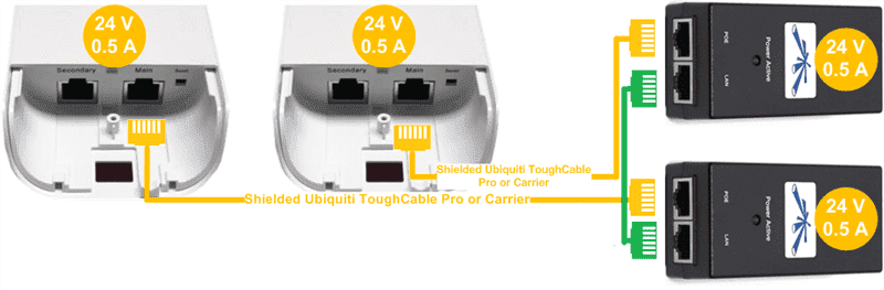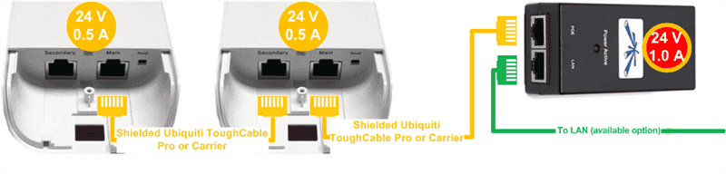 Примечание: Это возможно только, когда UBNT устройство имеет второй Ethernet порт для активации. При включении, устройство позволяет PoE проводить питание через главный порт к вторичному, таким образом питая дополнительное устройство. Из консоли AirOS, выберите |Advanced| > Advanced Ethernet Settings > PoE Passthrough: [X] Enable.