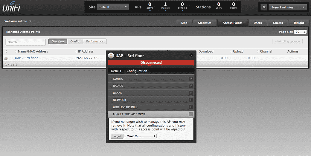 Когда вы добавляете по умолчанию новый AP на ваш UniFi контроллер, то он будет принят, используя узел по умолчанию, и если вы хотите переместить его на другой сайт, вы можете сделать это, выполняя следующие действия: