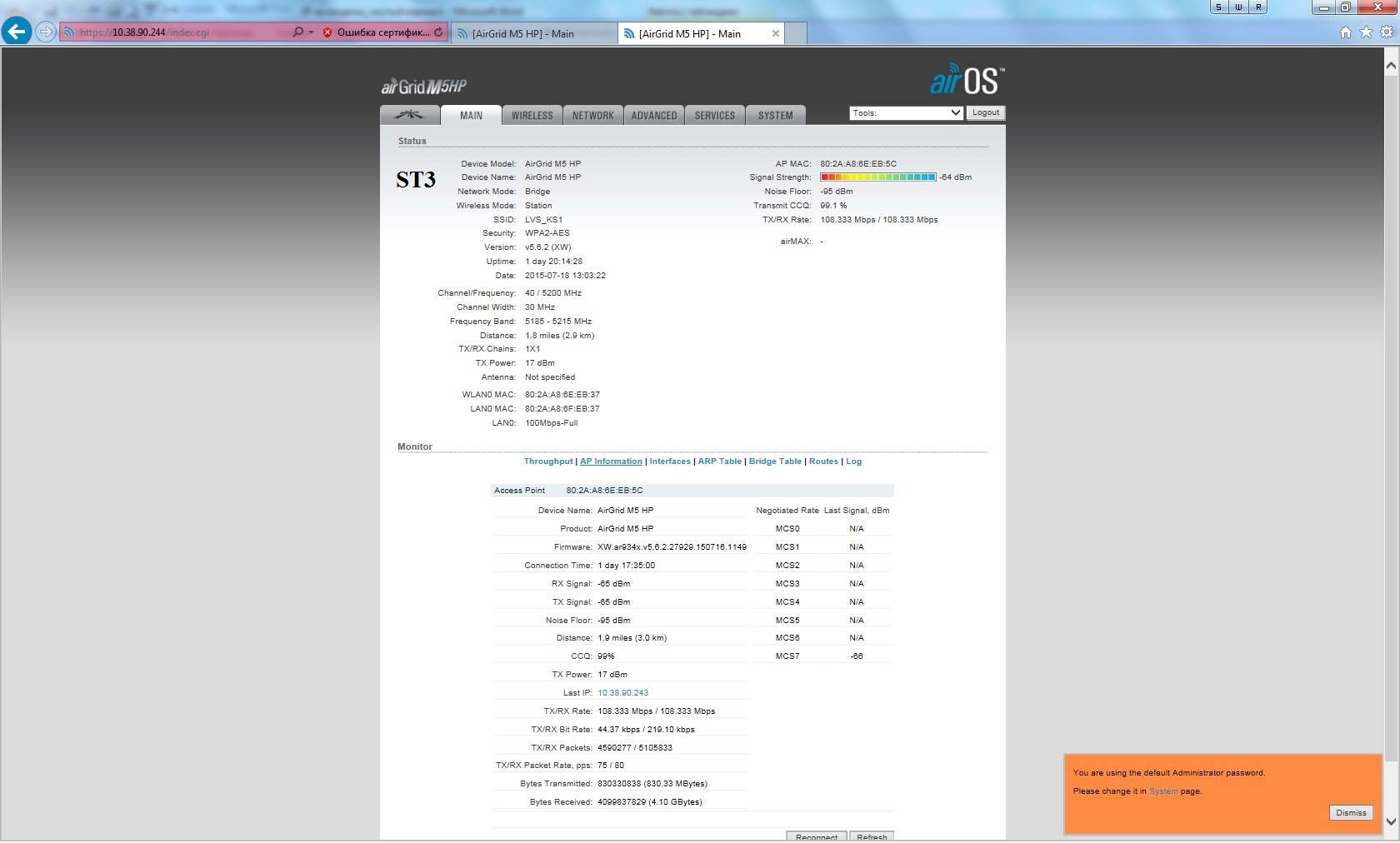 Имеются 3 моста, построенных на AirGrid M5 HP (во вложениях схемы и скрины вкладки MAIN). Проблема в низких скоростях. Пробовал скачаивать файл по мосту №3 (А3 и ST3). Скорость скачивания 600 кбит/с-1мбит/с. Сигнал хороший. Что может быть?