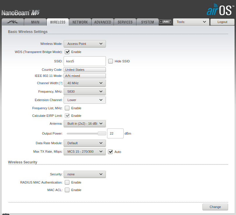 На раздачу стоит точка NanoBeam M5 16 подключенная к серверу кабелем, у клиента NanoStation loco M5. Бывает, что клиентская точка перестает пинговаться и на ней пропадает связь, при этом на точке в списке подключенных она присутствует, на сервере мак-адрес клиентской точки видно. Помогает либо "кикнуть" клиентскую точку в списке на раздающей, либо перезагрузка клиентской. Такая ерунда может быть раз в неделю, а может за один день раз 5. Прошивка у всех v6.2.0