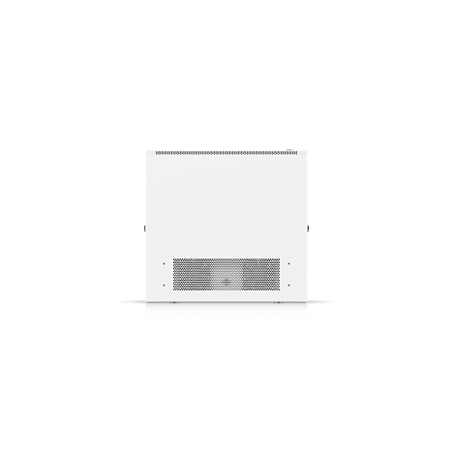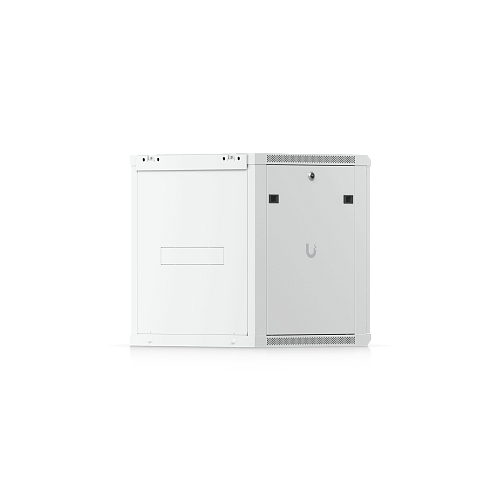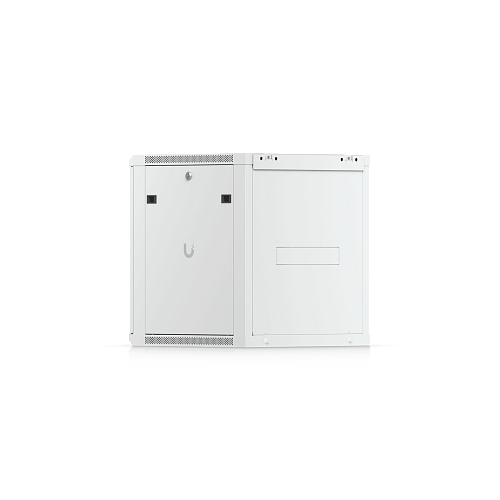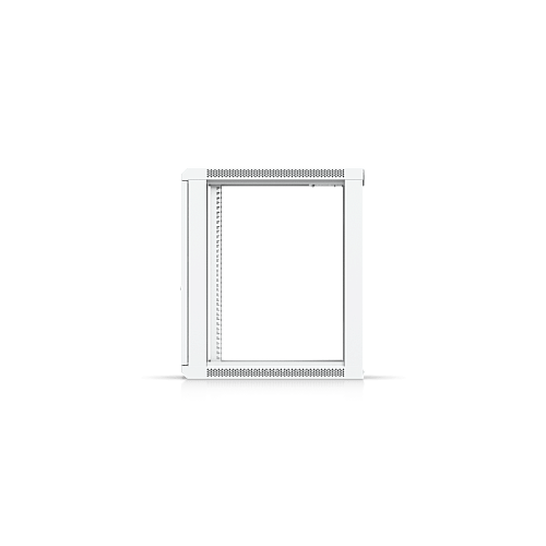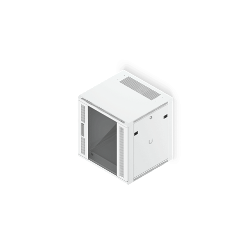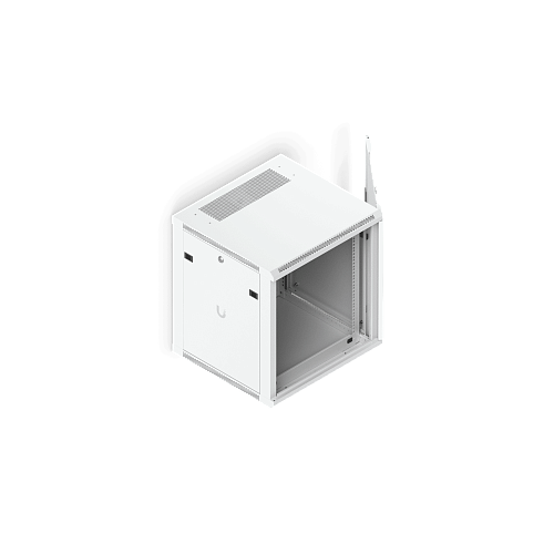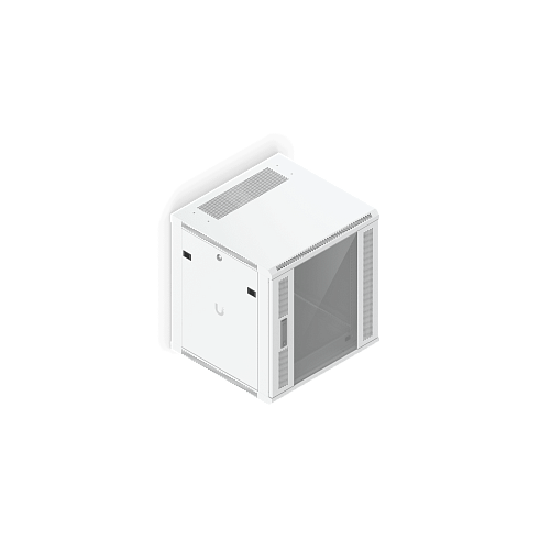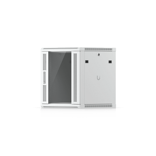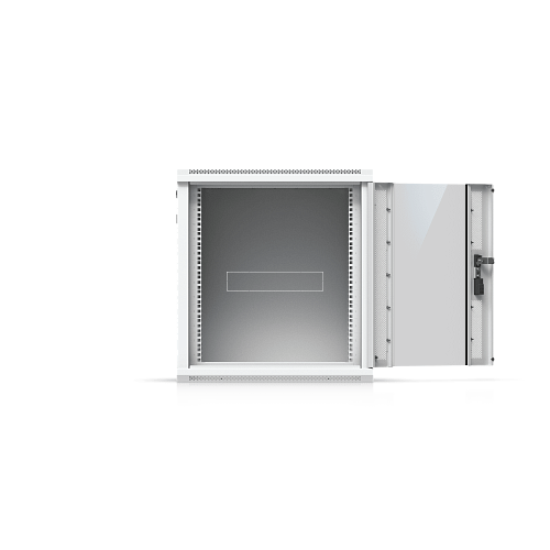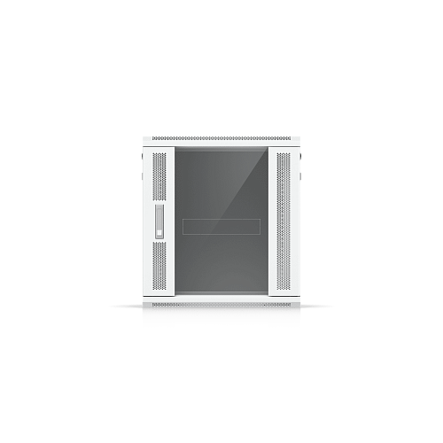 Полностью собранный, компактный настенный шкаф с стеклянной передней дверью, двумя вентиляторами и съемными боковыми панелями.