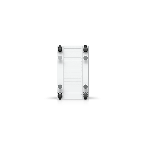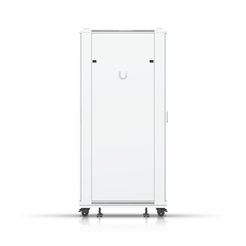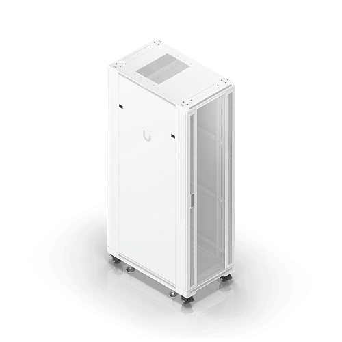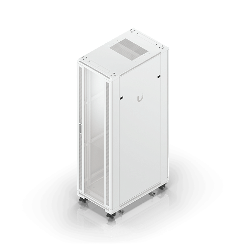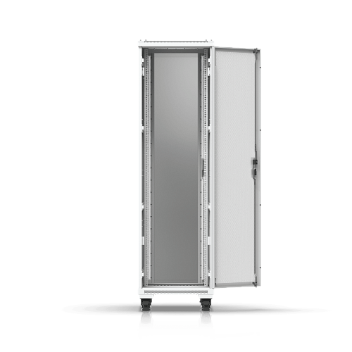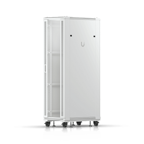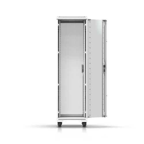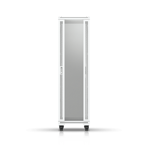 Полностью собранный напольный шкаф с стеклянной передней дверью, вентиляционной задней панелью, двумя вентиляторами и съемными боковыми панелями.