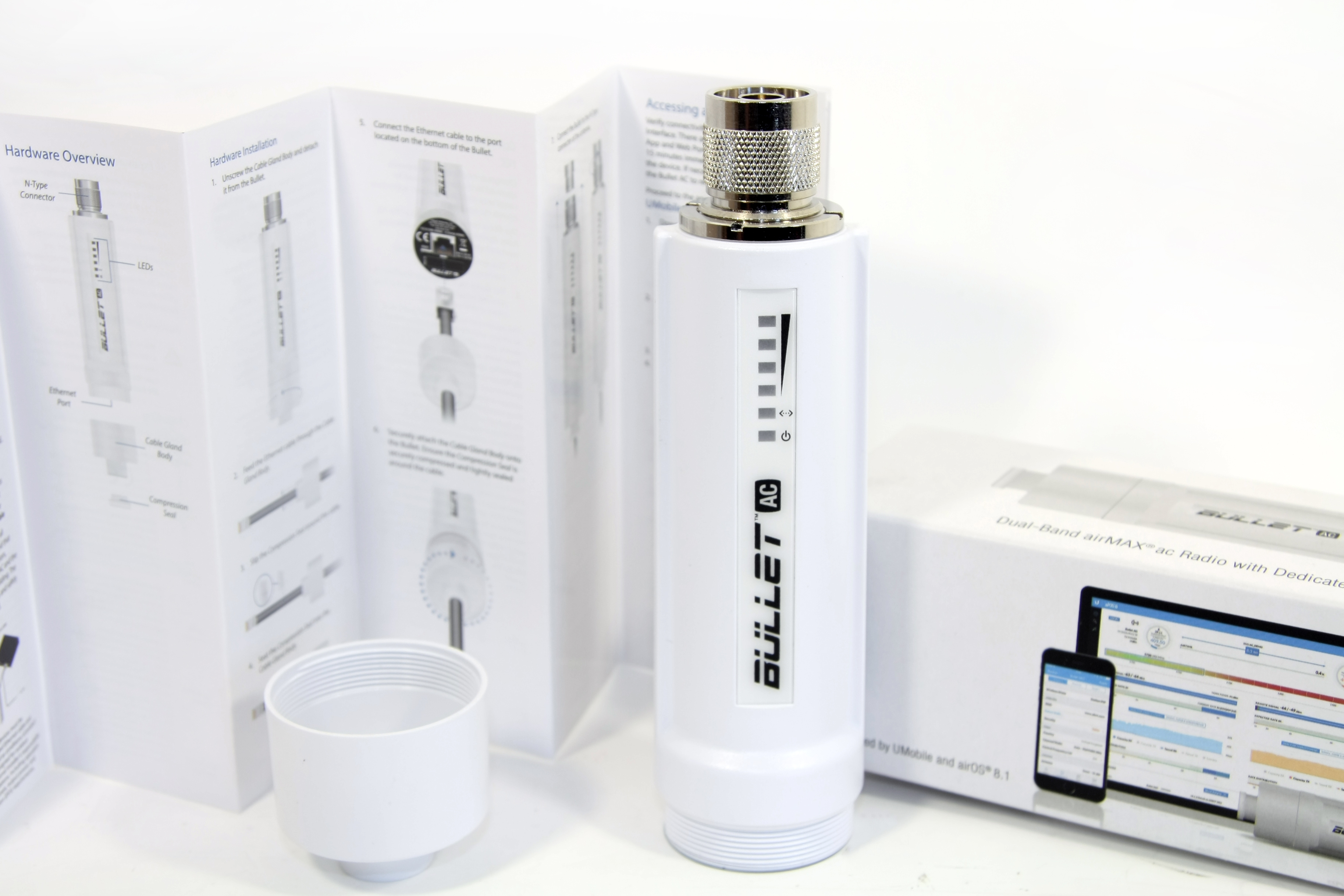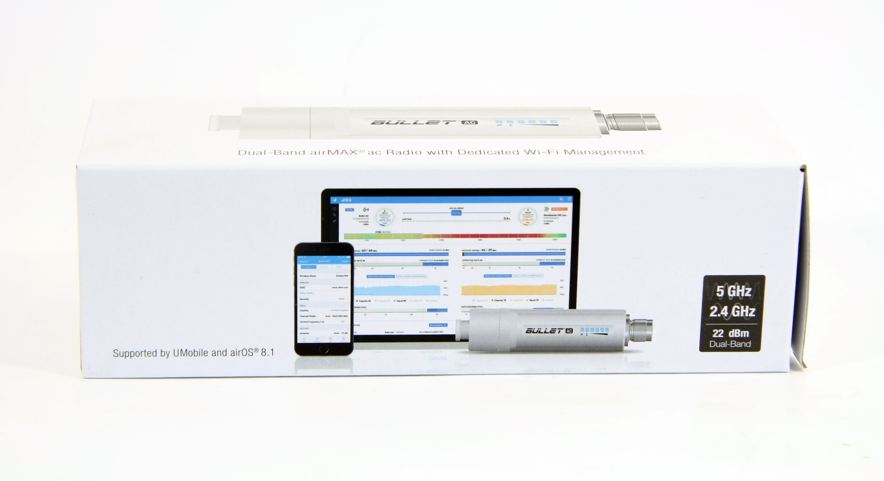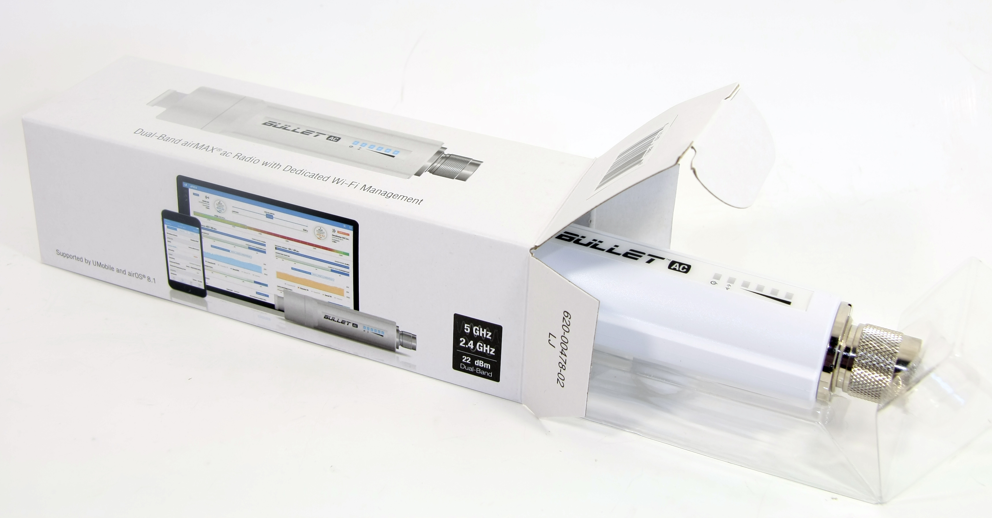 Bullet AC устроена по аналогичному принципу и внешне схожа с другим оборудование серии. Однако, в отличии от радиомостов предыдущего поколения, новая B-DB-AC поддерживает поллинговый протокол последнего поколения AirMax AC, благодаря чему пропускная способность Bullet AC превышает 300 мбит/Сек. Поддерживается приоритизация трафика QoS, обеспечивающая максимальное качество при передачи потокового аудио и видео.