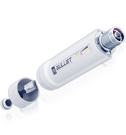 Радиомодуль airMAX Bullet M2 BulletM2-HP работает в диапазоне температур от -40 до +70°C. Все соединения герметичны, а на корпусе имеется индикатор уровня сигнала для упрощения настройки антенны.