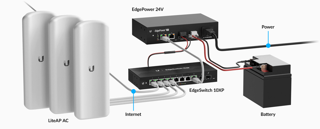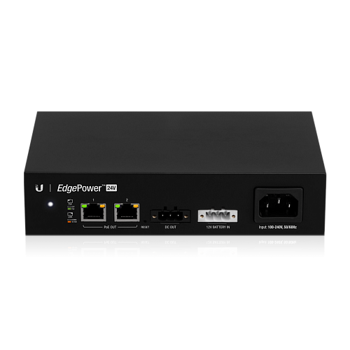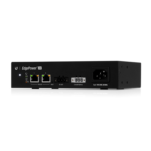 Блок питания имеет два выхода 10\100 Ethernet, с поддержкой технологии раздачи питания PoE, а так же выход постоянного тока 24 v, с трехконтактным разъемом, а так же отдельный вход для зарядки резервного аккумулятора. В случае перебоя с электроэнергией питание переключается на аккумулятор.