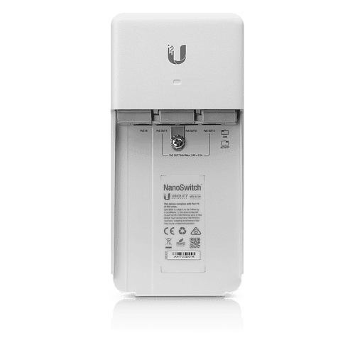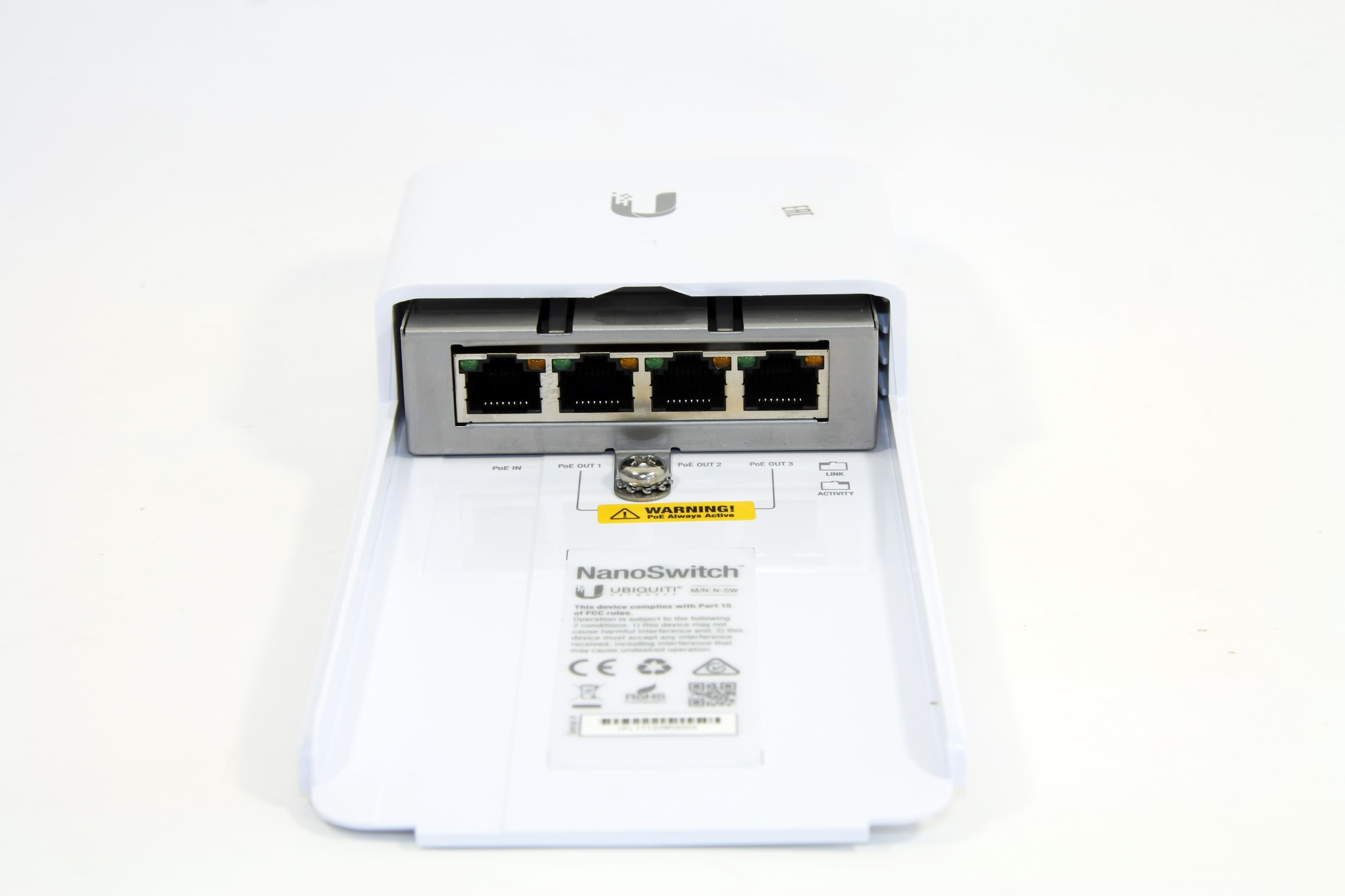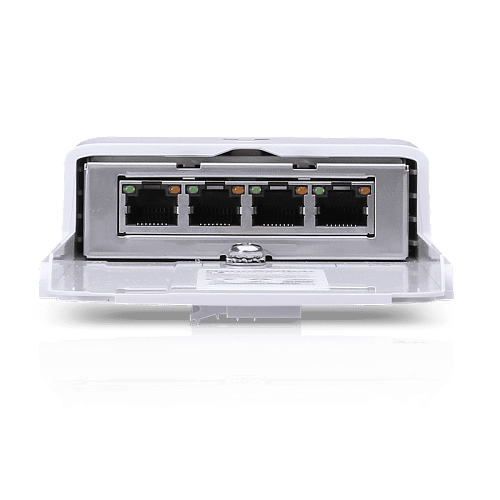 NanoSwitch имеет 4 гигабитных Ethernet порта с возможностью раздачи PoE суммарной мощность до 36 ватт, и до 24 ватт на один порт. Питание устройств обеспечивается по схеме Passive PoE. Все порты традиционно для оборудования Ubiquiti оснащены светодиодной индикацией состояния, по которой легко определить активность подключения, его скорость, а так же наличие раздачи PoE .
