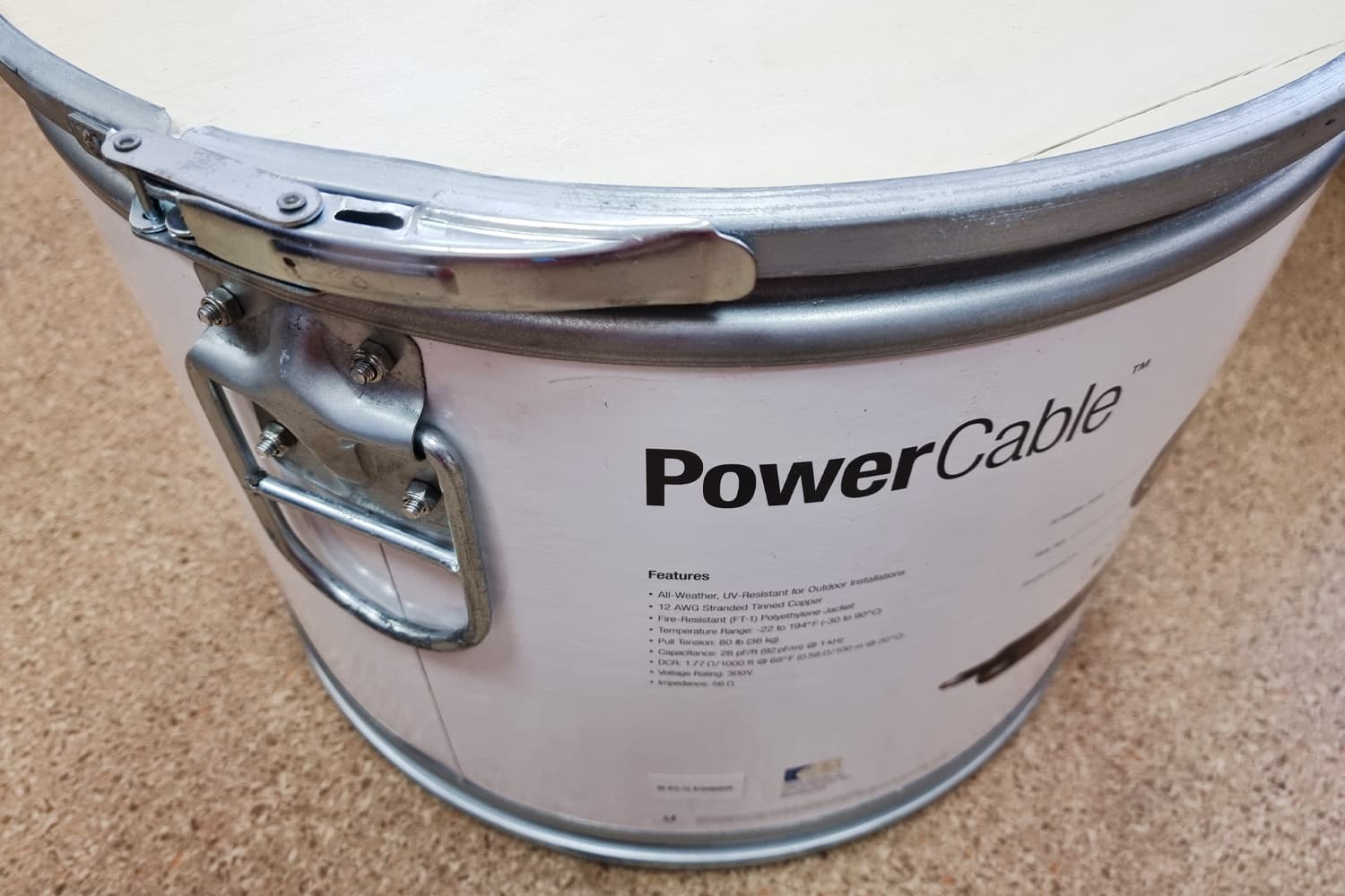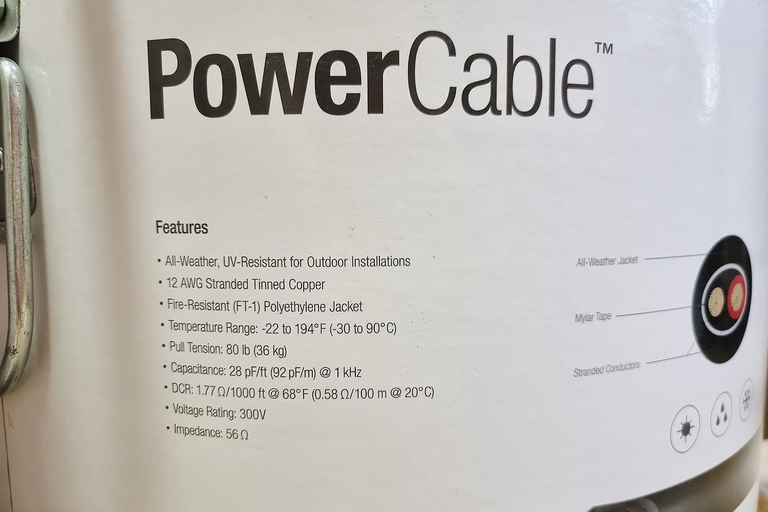 Диапазон допустимых для эксплуатации температур составляет от – 30 до + 90 градусов. Провод кабеля многожильный и имеет американский калибр 12 AWG, что соответствует диаметру 2.05 мм. Максимально допустимое напряжение при использовании PowerCable 12 достигает 300 вольт, сопротивление кабеля 1.77 Ом на 305 м.
