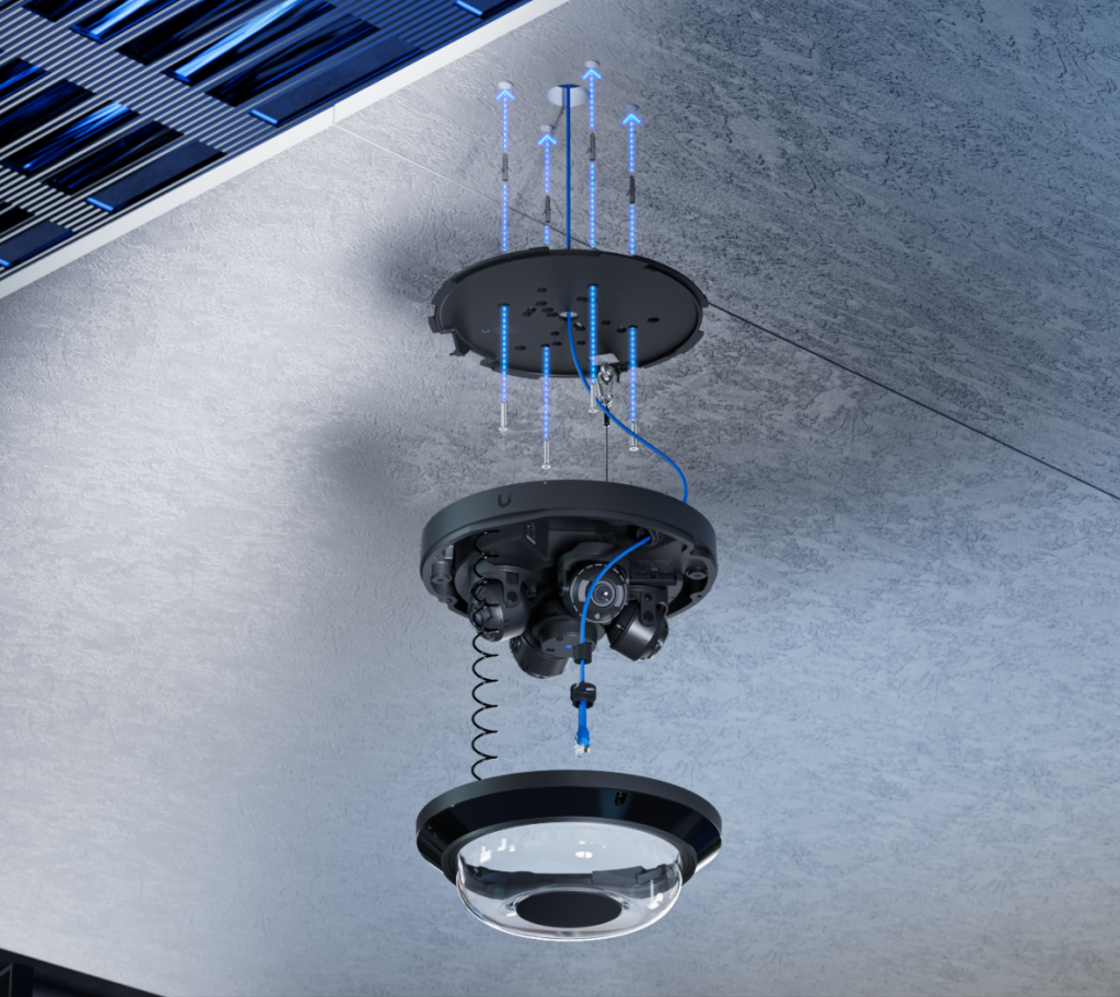 AI Multi Sensor 4 поставляется с потолочным креплением и поддерживает дополнительные варианты установки: на столб, стену, угол или подвес. Для монтажа на потолке камера совместима с креплениями T-bar, распределительными коробками 3.5″ и 4″ круглого типа, 4″ квадратными коробками, одноместными коробками и европейскими розеточными коробками, что обеспечивает широкие и гибкие возможности установки.
