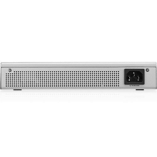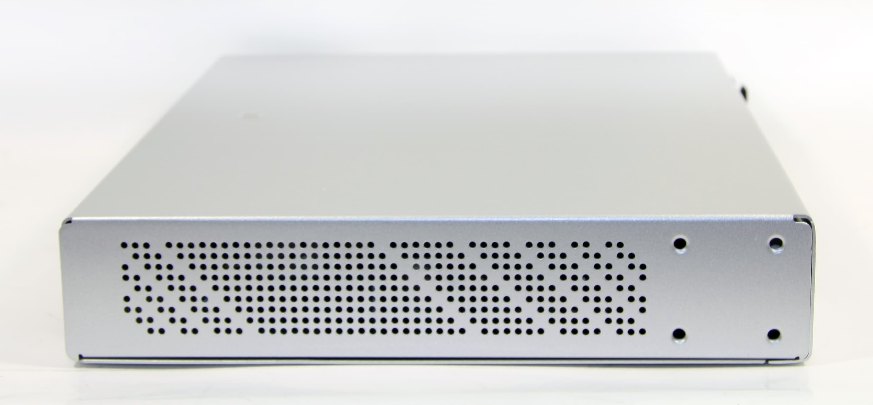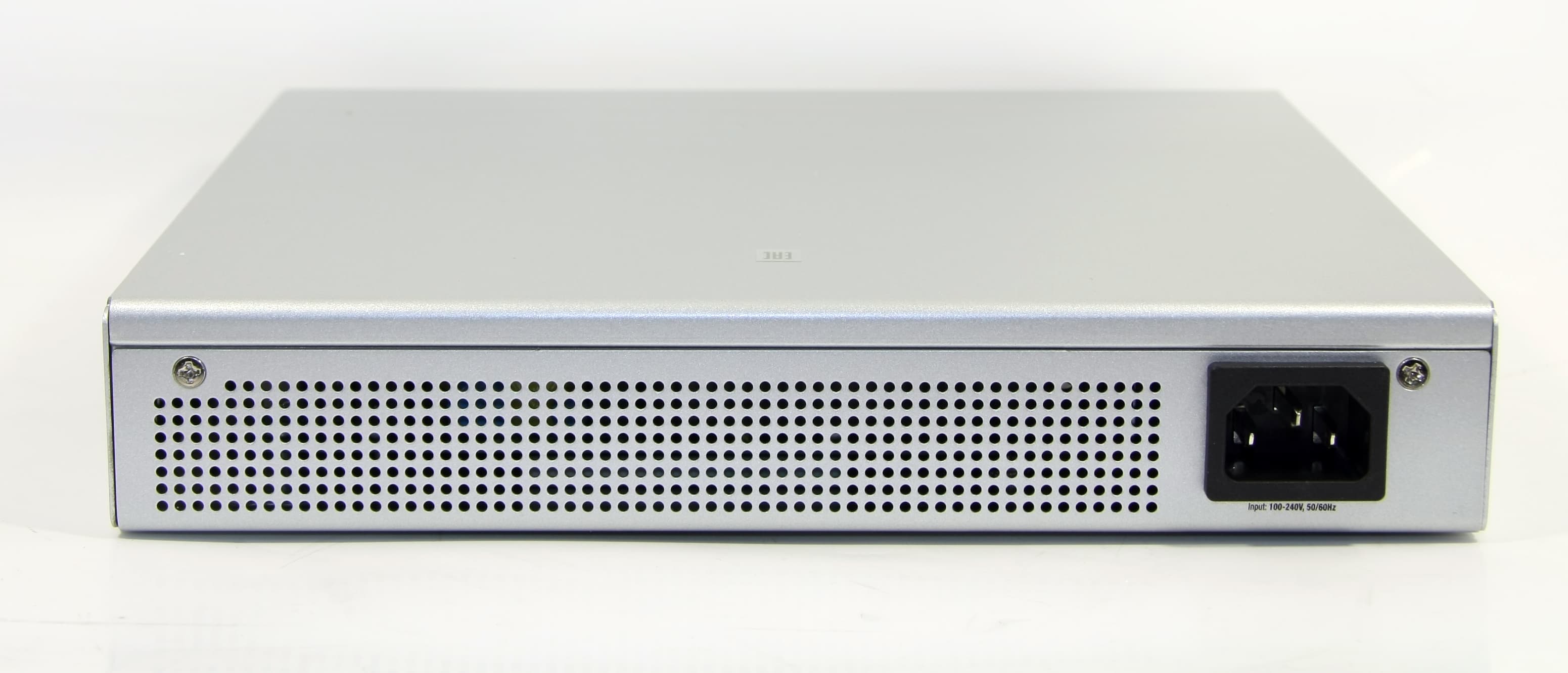 Стальной корпус коммутатора имеет высокую прочность, и характерный внешний вид для предназначенного к установке в серверную стойку оборудования. Вес устройства вместе с креплениями составляет 1.7кг, а по высоте коммутатор занимает в стойке один слот типоразмера U. Энергопотребление устройства зависит от режима работы и составляет до 150 Вт с раздачей питания PoE, и до 20 Вт без раздачи питания.