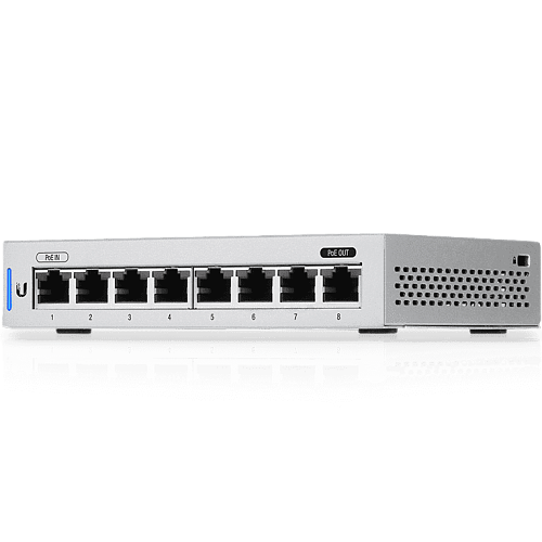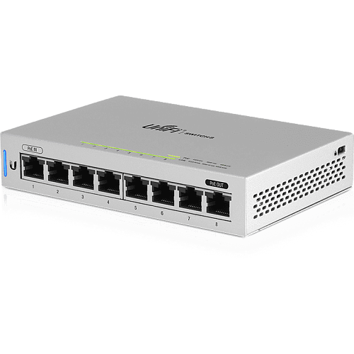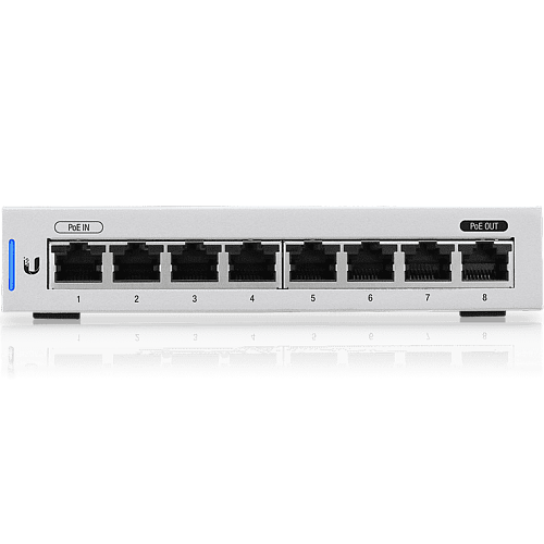 Для подключения оборудования коммутатор имеет 7 Ethernet портов, 1 порт используется для входящего трафика. При этом возможна сквозная передача питания PoE, которая организуется с использованием портов 1 и 8, что может быть востребовано при необходимости использовать совместно с UniFi Switch 8 портативный сервер управления UniFi Cloud Key.
