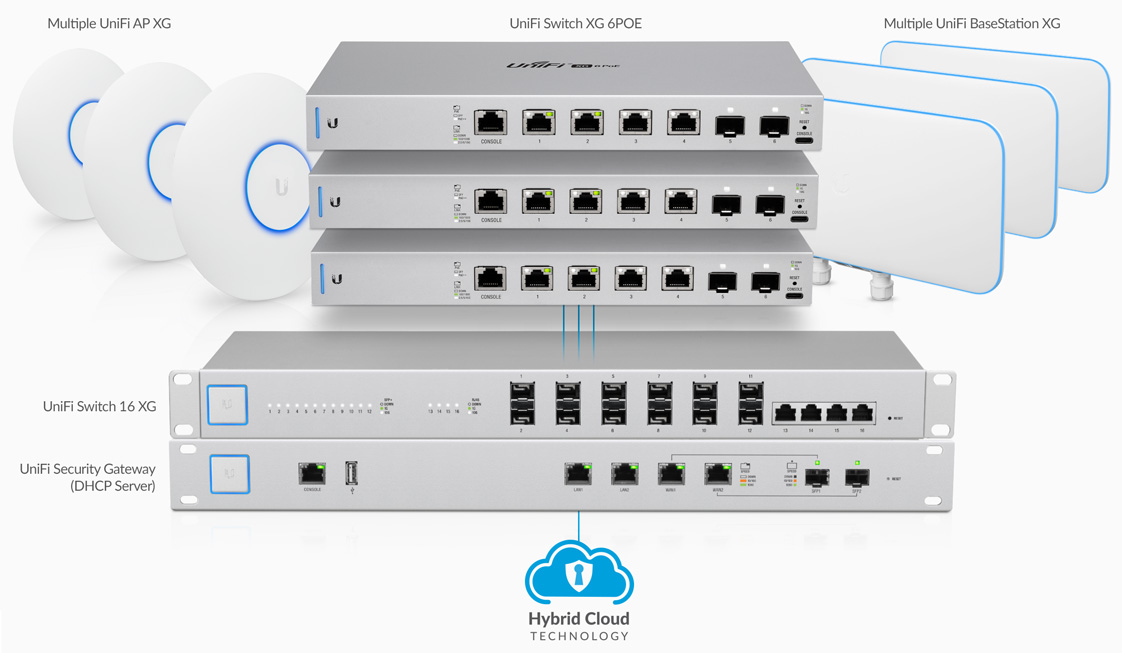 Коммутаторы US-XG-6POE подключаются через интерфейсы SFP+ к UniFi Switch 16 XG. В коммутационном шкафу коммутаторы соединяются с помощью кабелей UC-DAC-SFP+, а к этажным коммутаторам сигнал передается по волоконно-оптическим линиям. UniFi Switch XG-6POE передаёт данные и 802.3bt PoE++ на несколько точек доступа UniFi BaseStation XG (UWB-XG) и UniFi AP XG (UAP-XG).