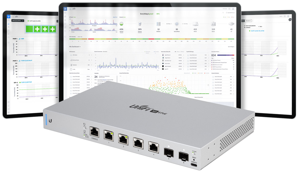 Особенностью UniFi Switch XG 6POE является поддержка высокоскоростных стандартов передачи данных на Ethernet портах 802.3bz, обеспечивающих скорость передачи данных по витой паре до 10 Гбит/Сек. Так же возможно и соединение на скорости 10 Гбит/сек, при использовании с соответствующими свитчами серии UniFi либо EdgeSwitch поддерживающих 10GBaseT.