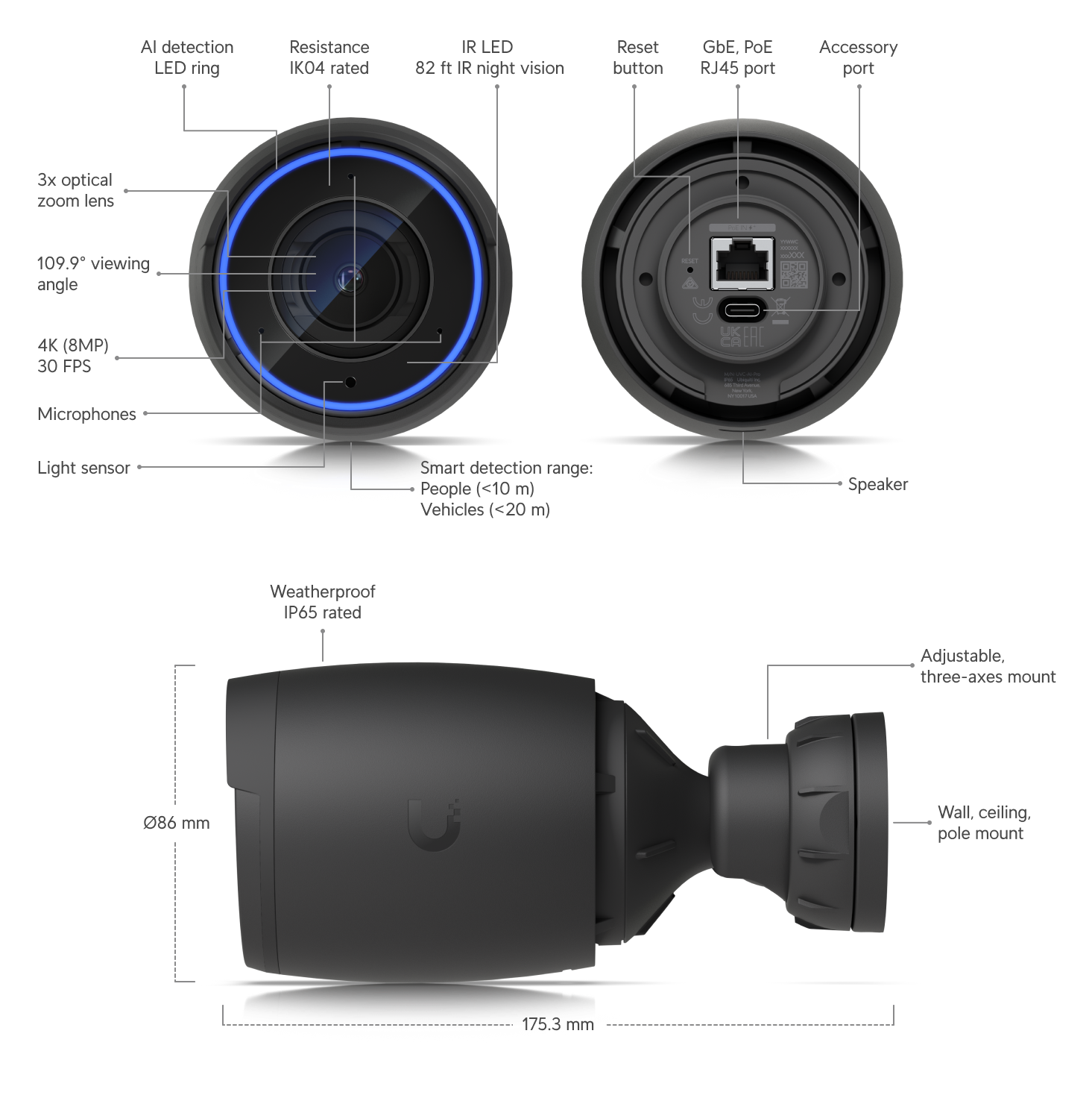 Ubiquiti AI Pro - это высококачественная 4K IP-камера, предназначенная для внутреннего и наружного использования. С 3-кратным оптическим зумом и умным обнаружением на большом расстоянии, эта камера обеспечивает высокое разрешение видео (8MP) и расширенные функции ИИ, такие как обнаружение людей и распознавание номерных знаков.