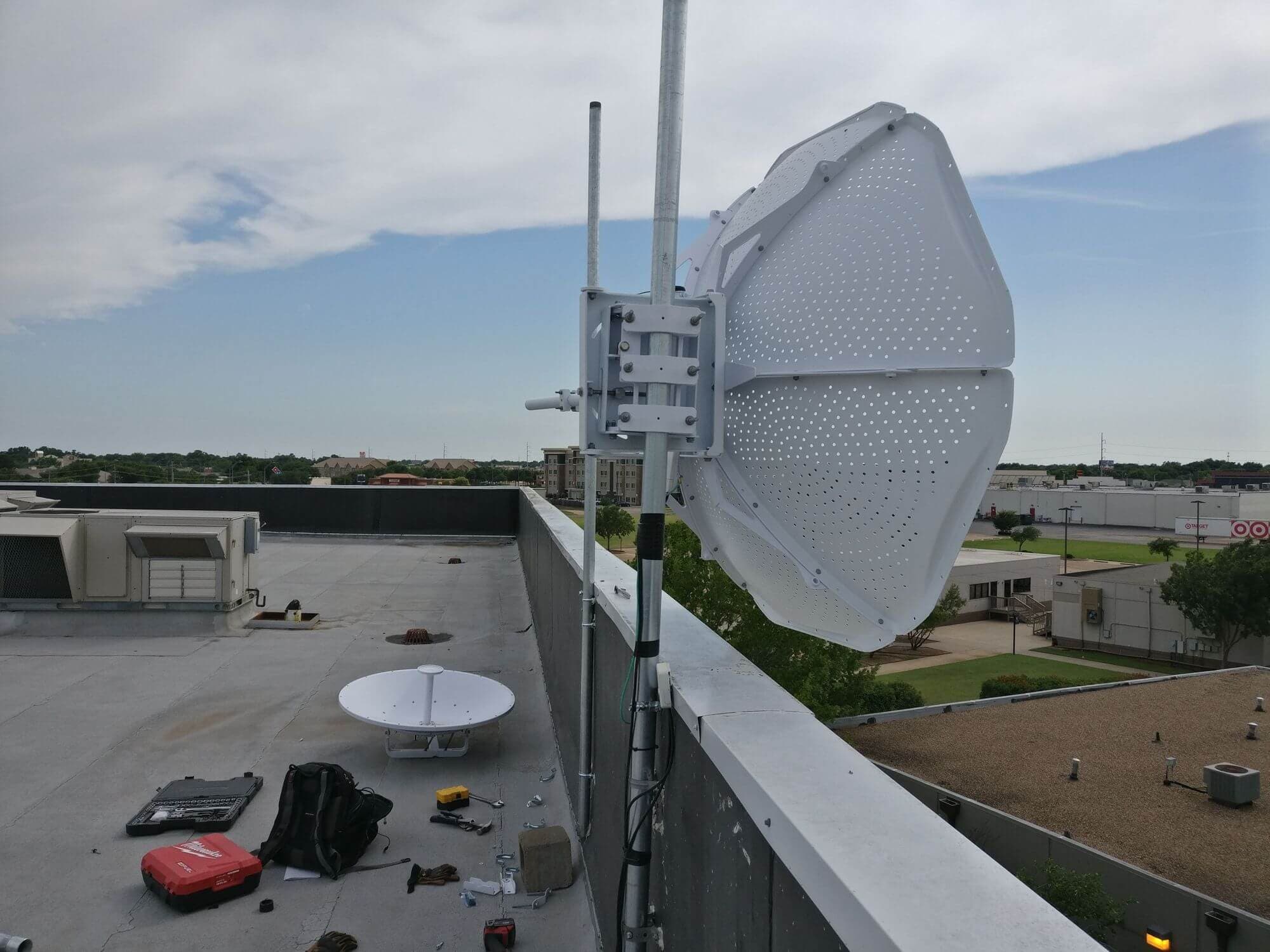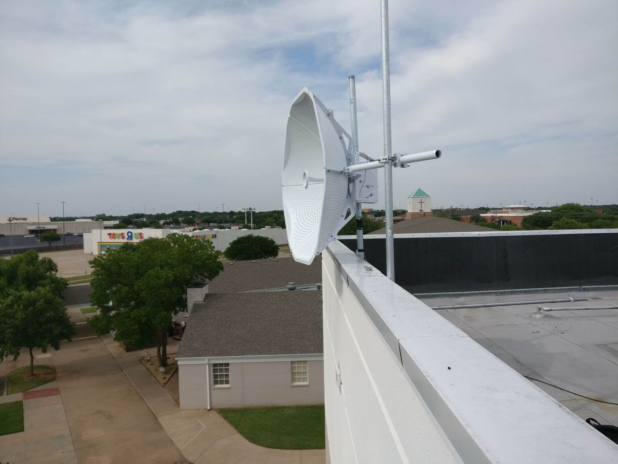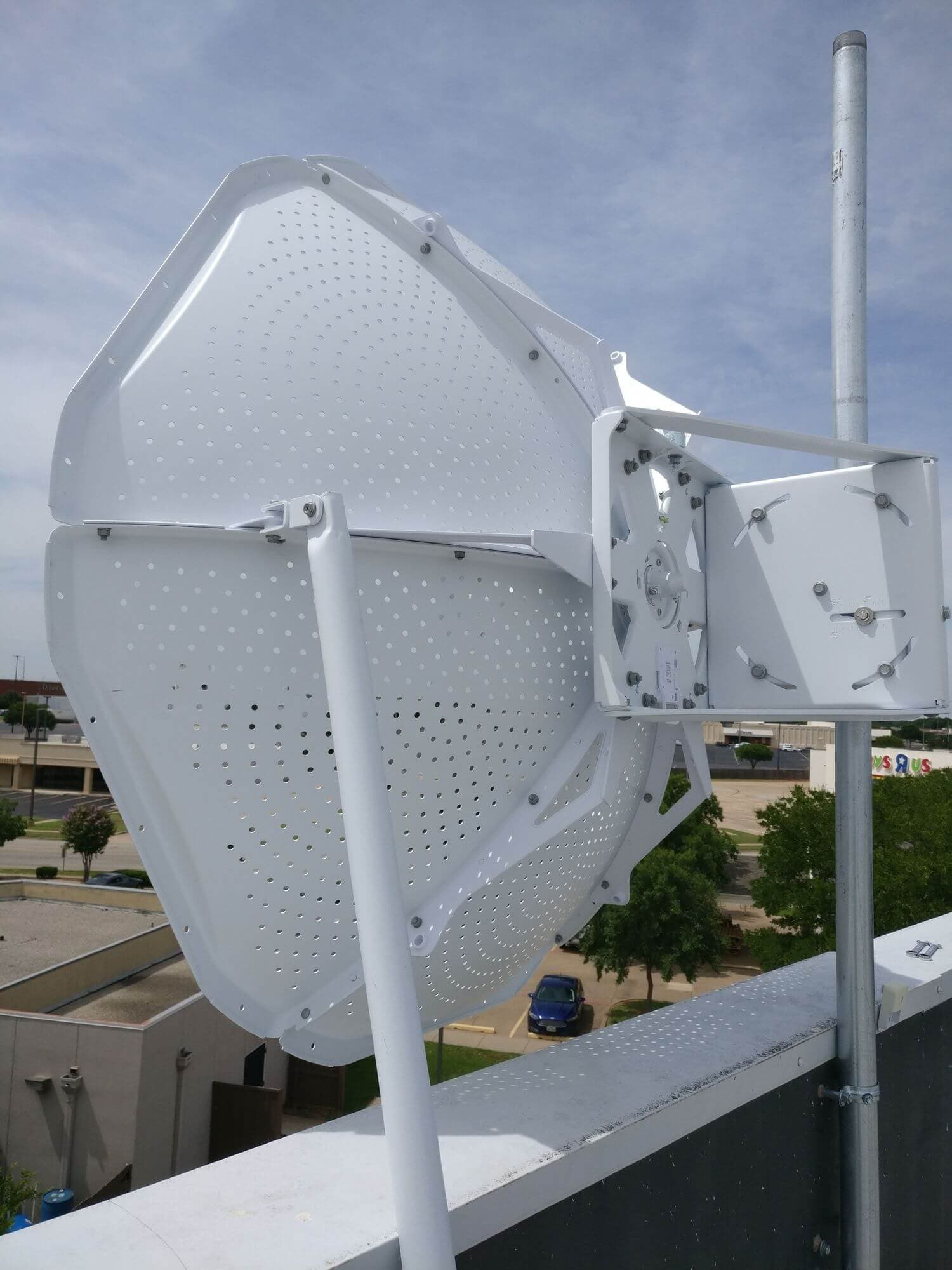 Излишне говорить, что размер Ubiquiti MonsterDish 5G 37 оправдывает свое название. Это действительно настоящий монстр! Нам потребовалось около 6 часов, чтобы поднять антенну на крышу, собрать и установить новые столбы, дабы как следует закрепить нашего “монстра”.