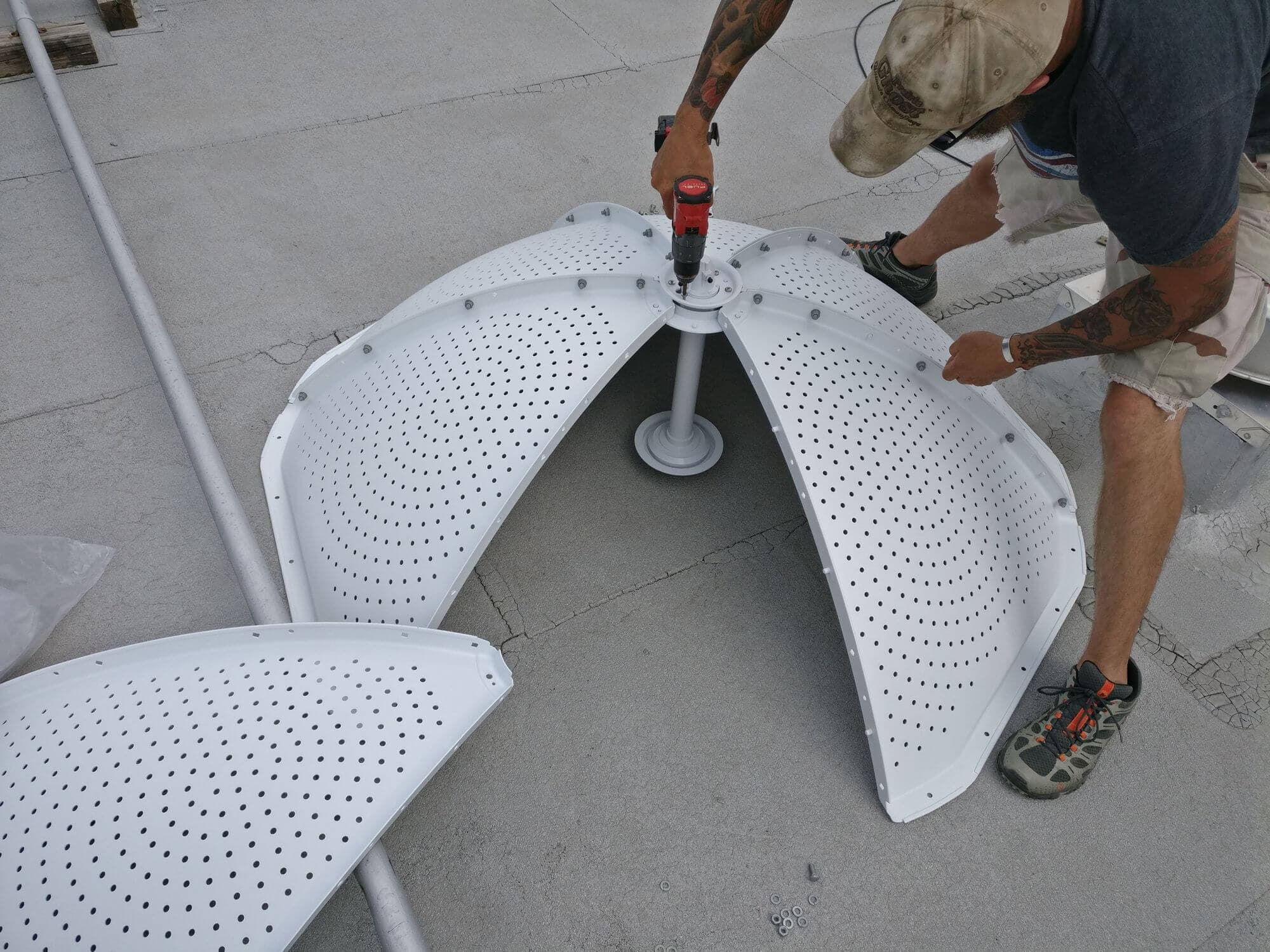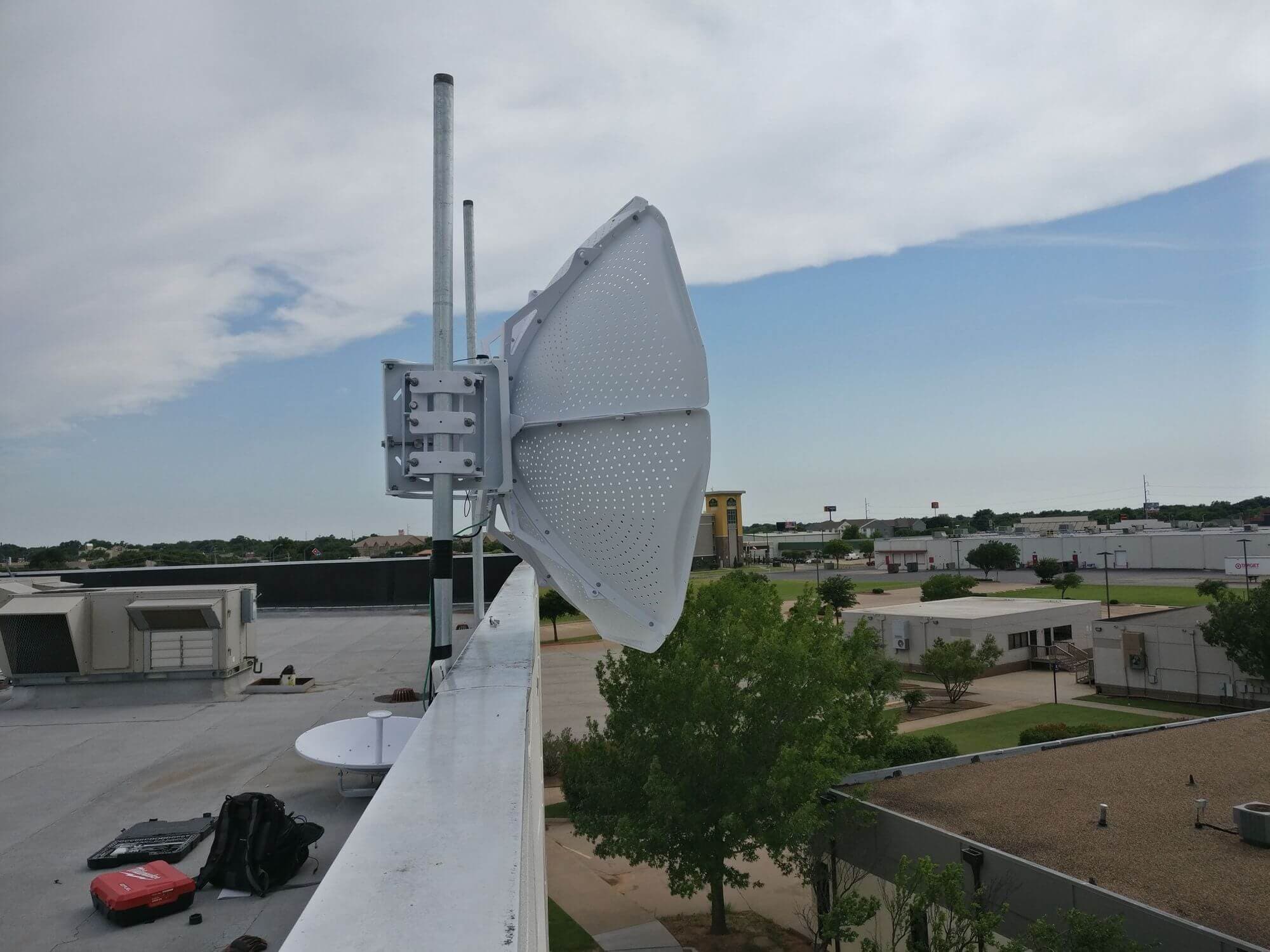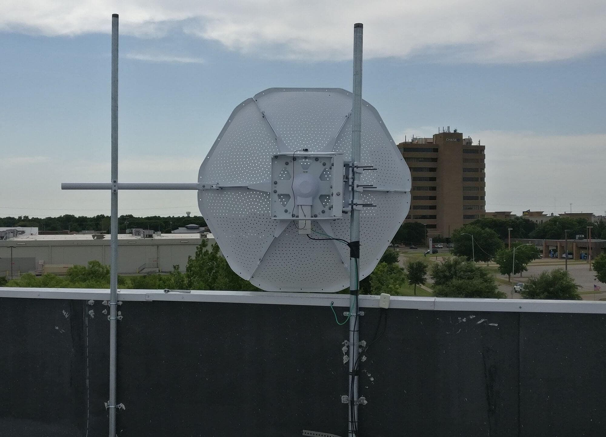 Излишне говорить, что размер Ubiquiti MonsterDish 5G 37 оправдывает свое название. Это действительно настоящий монстр! Нам потребовалось около 6 часов, чтобы поднять антенну на крышу, собрать и установить новые столбы, дабы как следует закрепить нашего “монстра”.