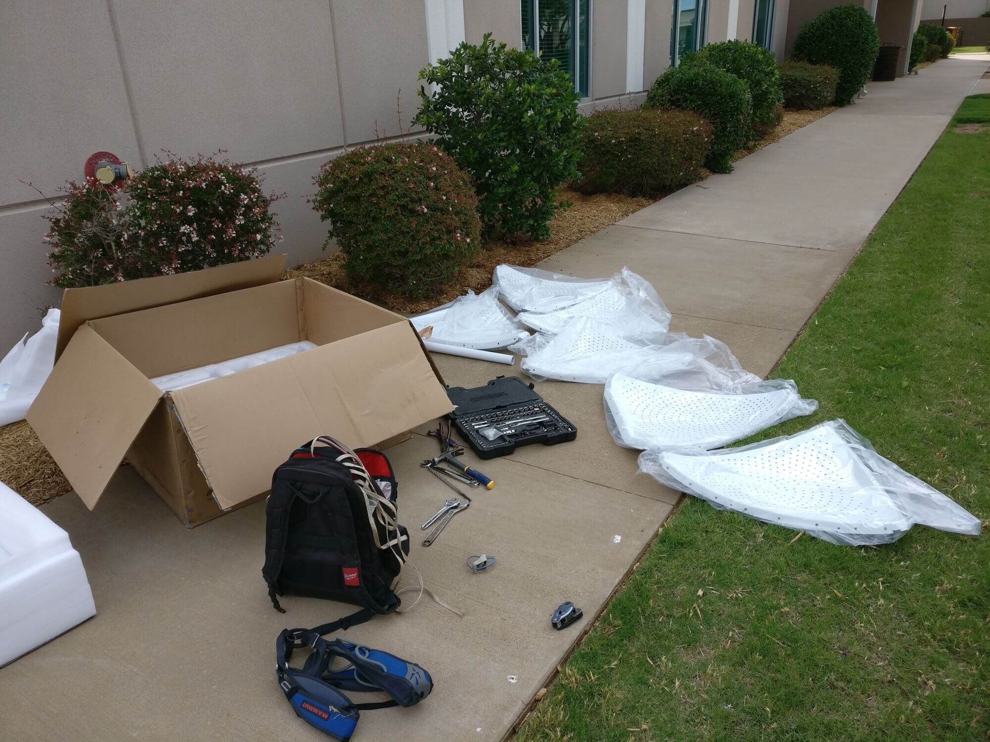 Для нашей старой антенны AirFiber 34 дБи мы использовали в качестве крепления 2-дюймовую трубу EMT, закрепленную в бетонной стене с помощью анкеров и металлических хомутов. То, что систему крепления придется модернизировать стало ясно сразу, после того как сотрудники транспортной компании выгрузили коробку с MonsterDish 5G 37 на пороге нашего офиса. Вес ее составил 41 килограмм!