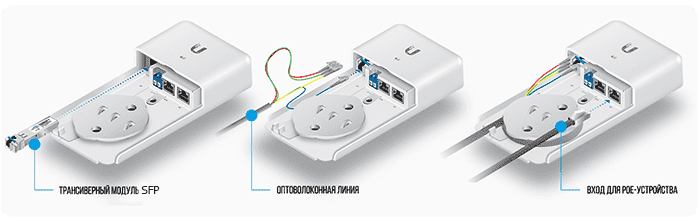 Для подключения к сети устройство имеет гигабитный Ethernet порт, слот SFP для подключения оптоволокна, а также DC Ethernet порт, для ввода/вывода PoE. Входное напряжение можно выбирать в зависимости от необходимости — поддерживаются PoE 24v/50v. Также Fiber PoE имеет клеммную колодку, которая аналогично же DC Ethernet порту может использоваться как для подключения питания и его последующей PoE раздачи, так и для вывода энергии и его передачи другим устройствам.