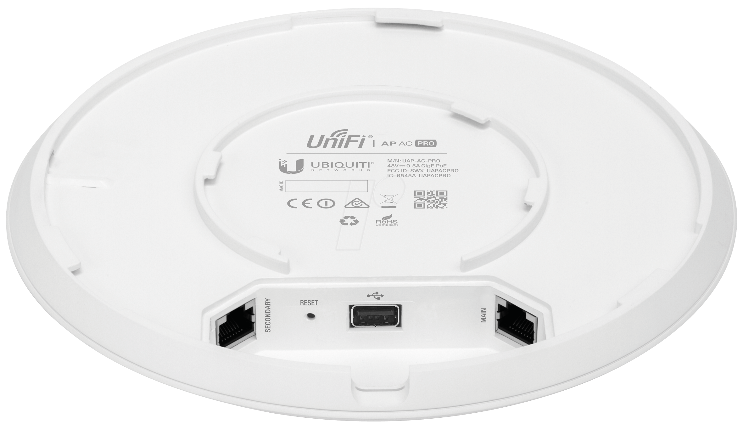 Другой особенностью точек доступа из набора Ubiquiti UniFi AC Pro AP 5 pack является наличие сразу двух гигабитных интерфейсов Ethernet. Второй используется исключительно для передачи данных и не может раздавать питание, однако его присутствие позволяет соединить оборудование на уровне физической сети и избежать потерь скорости, свойственных при передаче трафика по беспроводному каналу.