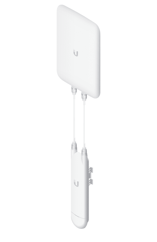 Антенна помещена в радиопрозрачный герметичный пластиковый корпус, который надежнозащищает ее металлические части от коррозии, а так же механических повреждений и загрязнения. Подключение к точке доступа осуществляется через два вч разъема типа RP-SMA. Рекомендуется использование фирменных кабелей Ubiquiti Networks, которые обладают высоким качеством и оптимальны для использования с UniFi Mesh Antenna.