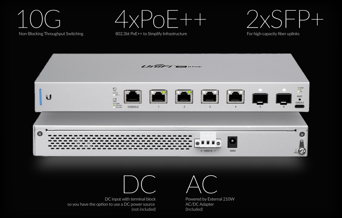 US-XG-6POE - новый высокопроизводительный свитч, уровня Layer 3, относящийся к серии оборудования UniFi. Особенностью модели является увеличенная до 10 гигабит скорость передачи данных по портам 10GbE при поддержке PoE++ 802.3bt и возможность подключения волоконно-оптических линий.